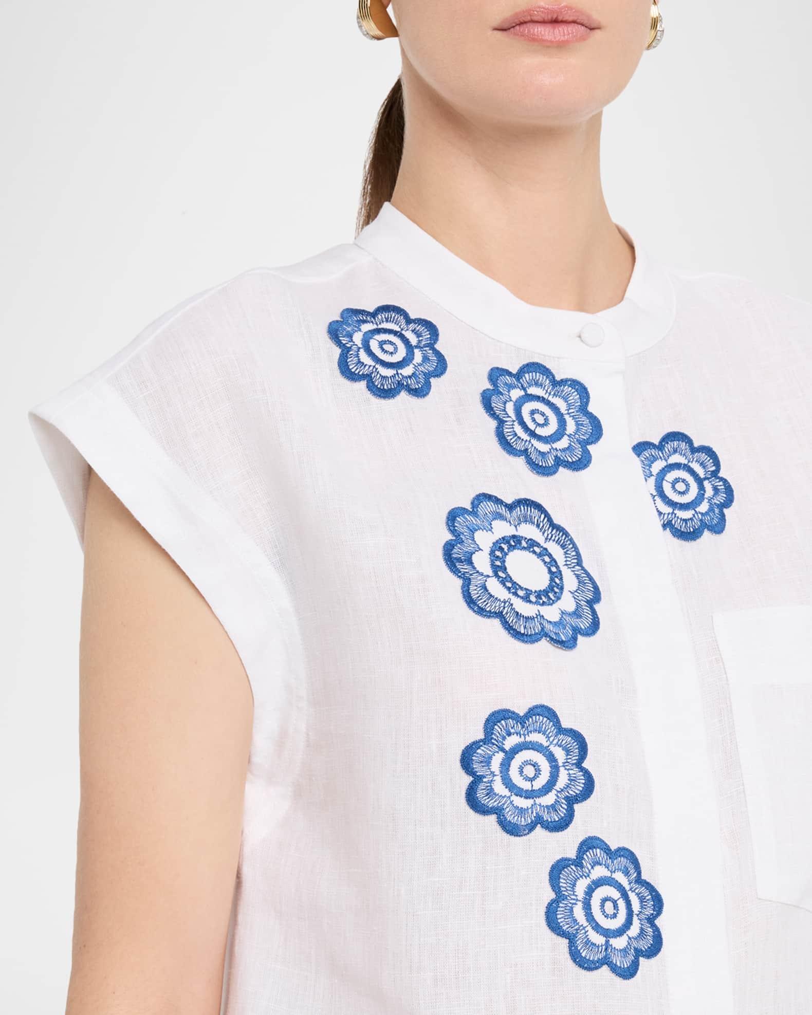 Adele Flower Embroidered Cap-Sleeve Linen Blouse