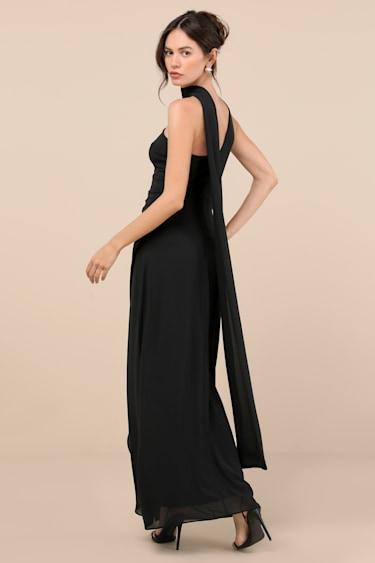 Mesmerizing any crowd is just what you'll do with this lovely chiffon gown, including a one-shoulder neckline that flows into an attached sash scarf. The figure-flaunting silhouette boasts strategic ruching along the side and continues down to a tulip-style skirt that creates a flirty slit-like detail. Hidden back zipper/clasp.