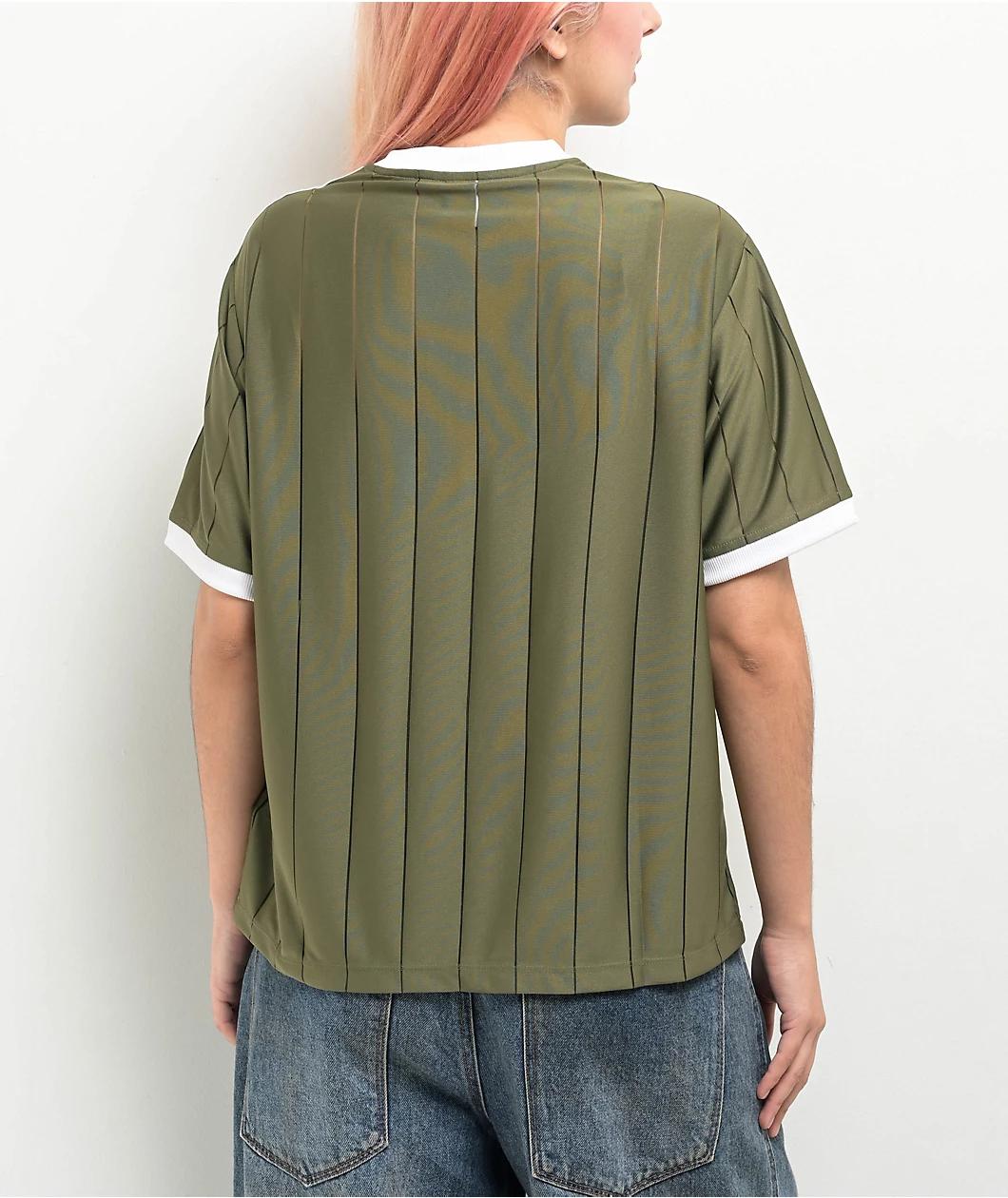 The adidas adicolor t-shirt celebrates the brand's athletic heritage with their signature 3 stripe appliques along the sleeves and pinstripe soccer jersey construction. Arriving in olive green, the loose fit silhouette and lightweight construction m