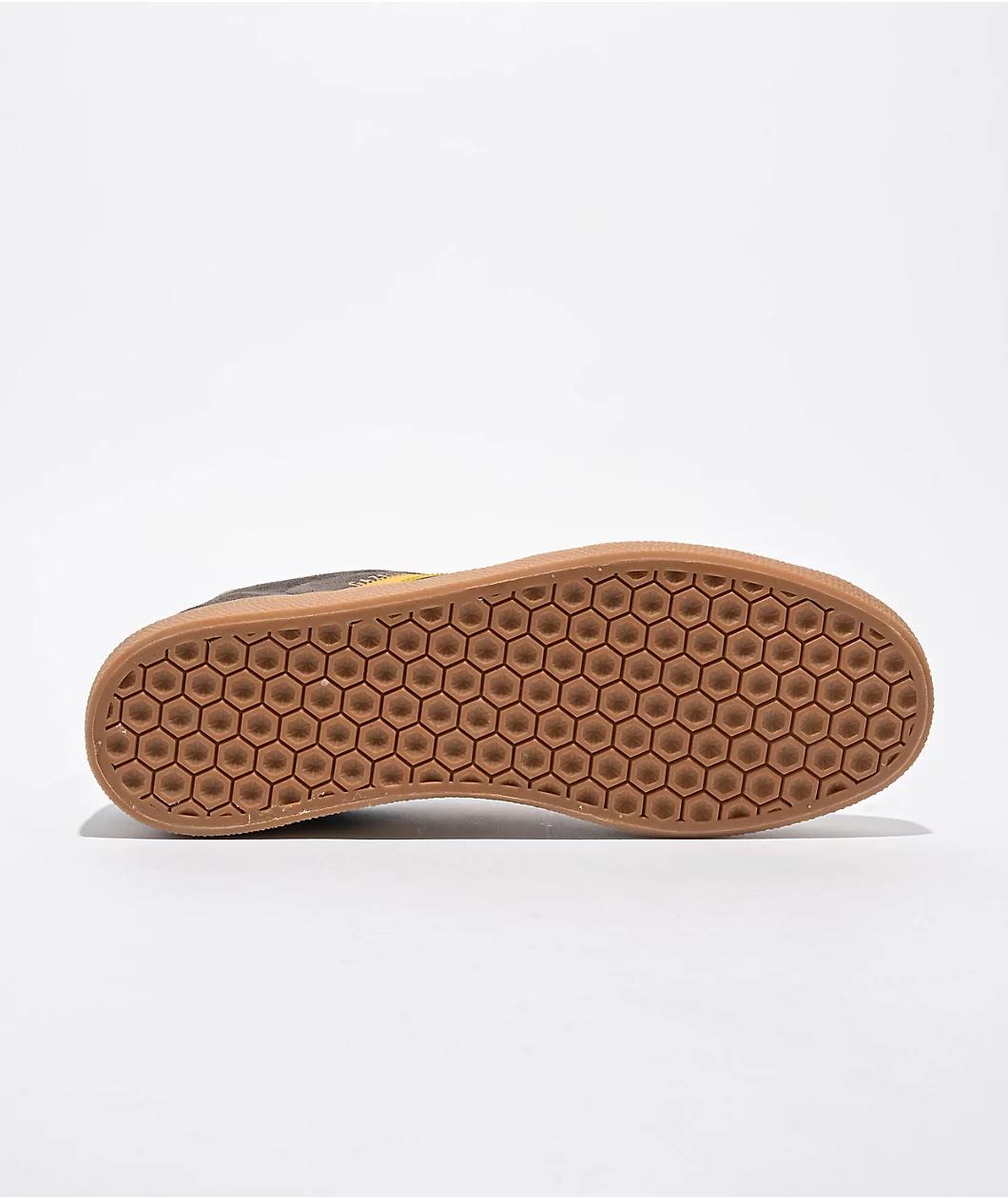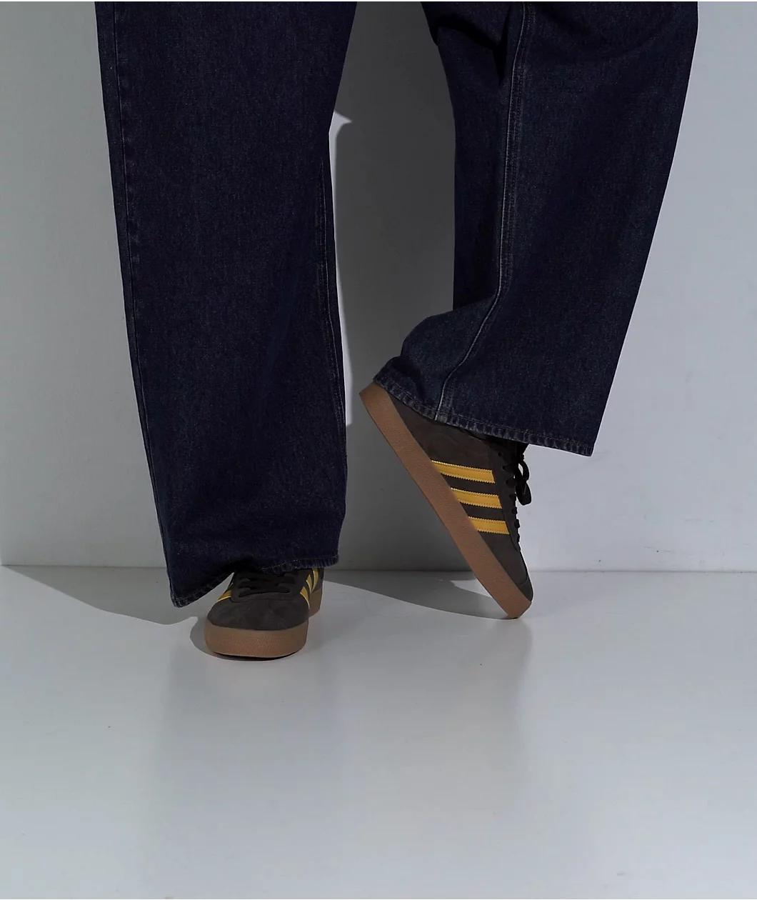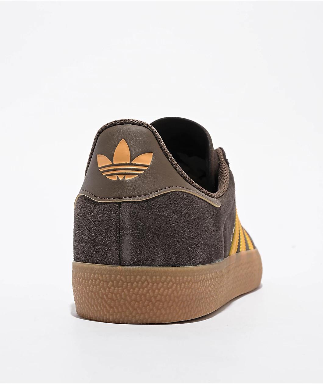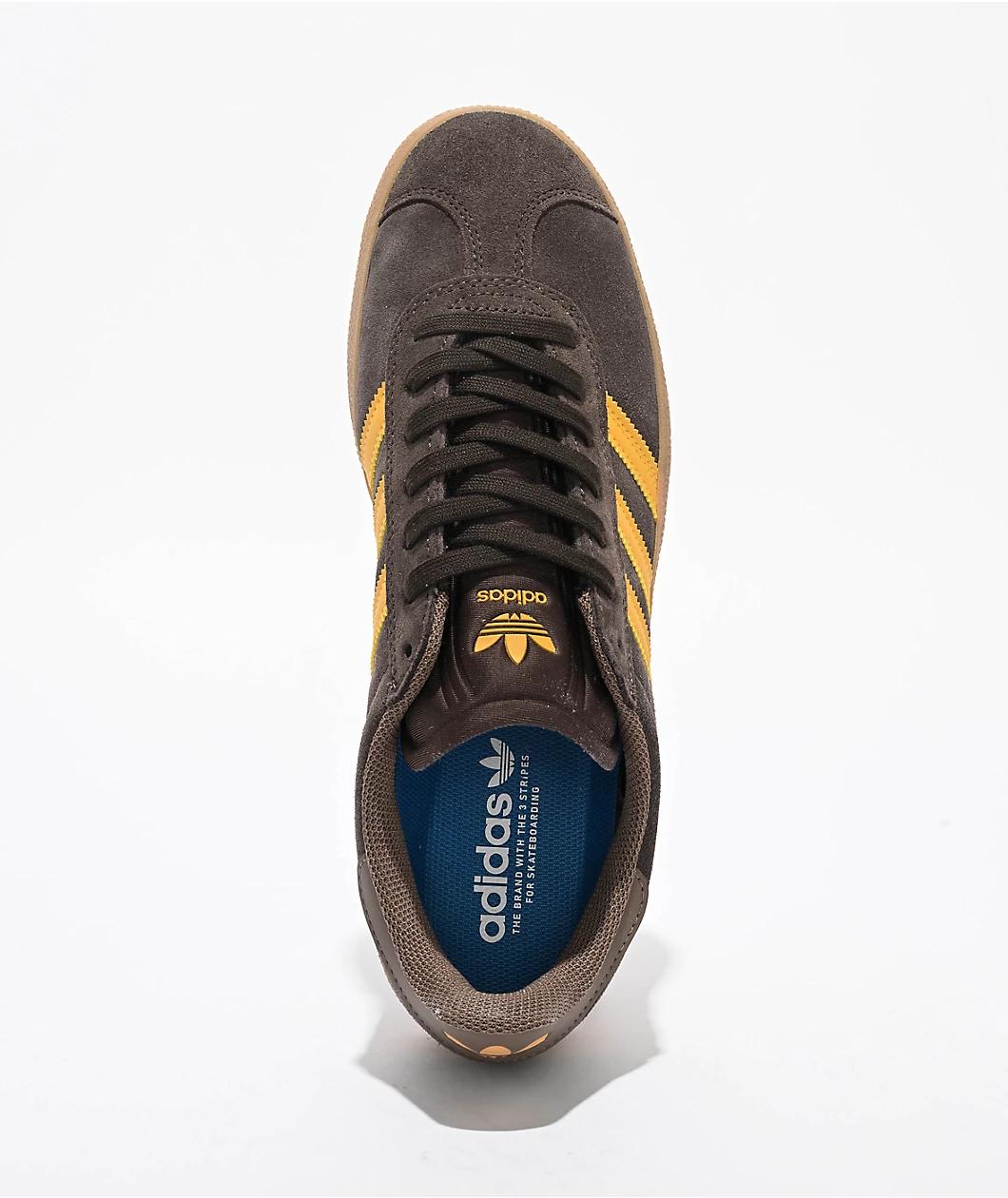 Sophistication meets skateboarding on the Gazelle ADV skate shoes from adidas, presented in an earthy dark brown suede upper with "Preloved" yellow accents and a brown gum outsole. Using a versatile low-top silhouette with a vulcanized construction,
