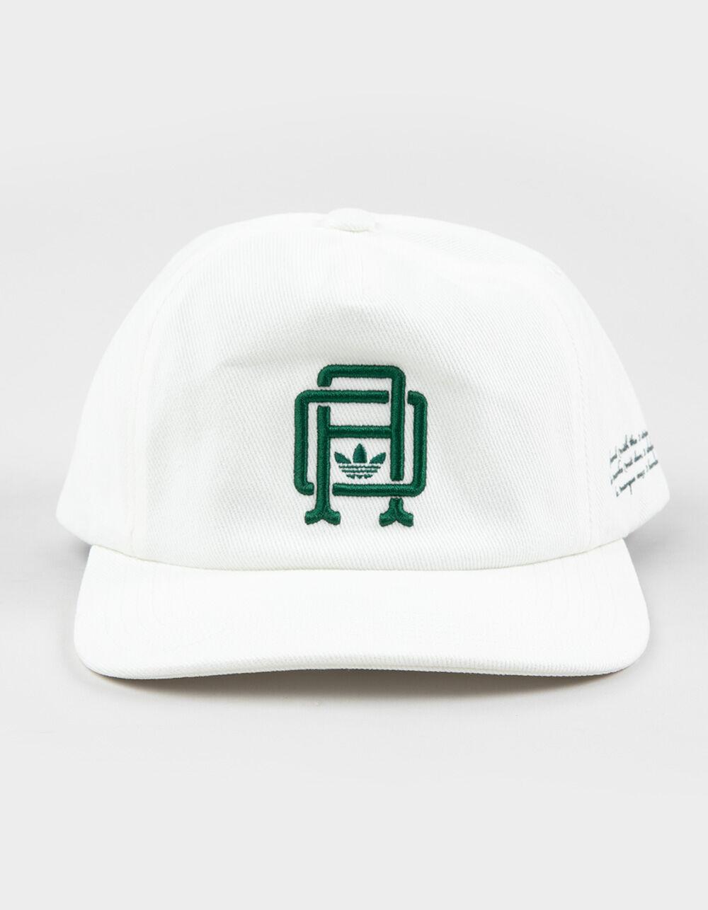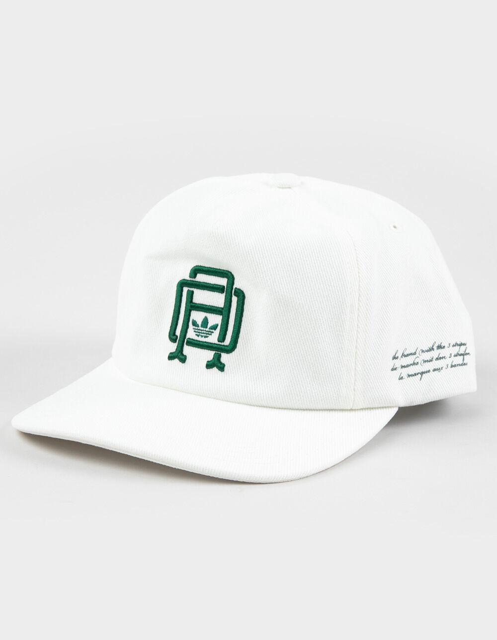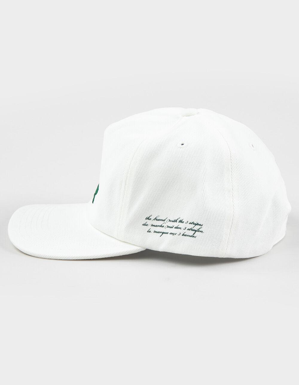 adidas Originals Collegiate Crest 5 Panel Strapback Hat. Made from a brushed cotton material, this adidas hat rocks a relaxed five-panel crown and a slightly curved brim. The strap and buckle in the back adjust to dial in the perfect fit. A multilingual "The Brand with the 3-Stripes" graphic accents the side. Relaxed fit. Adjustable strapback closure. 100% Cotton. Hand wash. Imported.