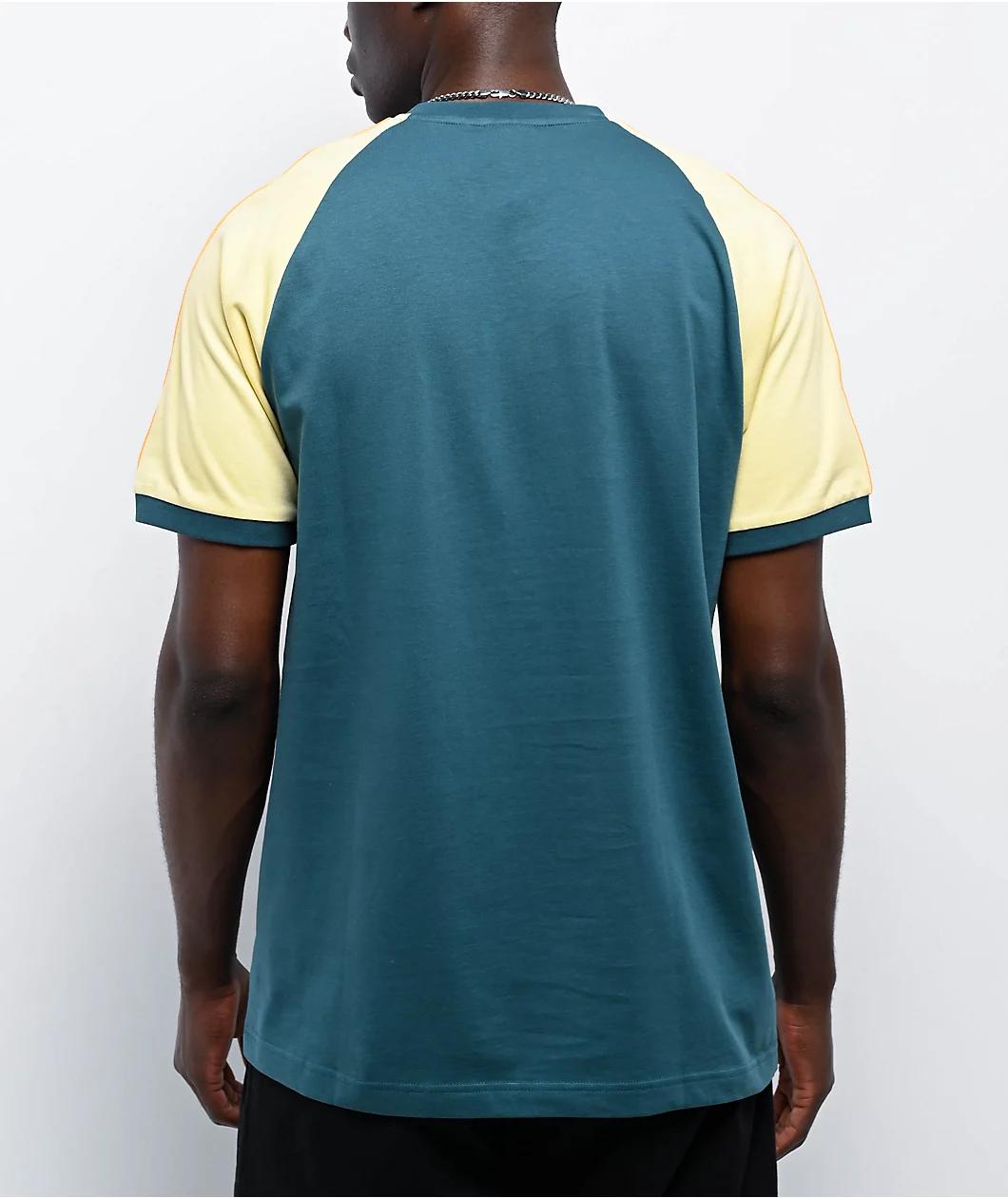 Add an athletic undertone to your outfit with the Superstar raglan t-shirt from adidas Originals in a green and yellow colorway. Light orange branding adorns the left chest, while 3-Stripe detailing is placed on both sleeves for a cohesive look. The