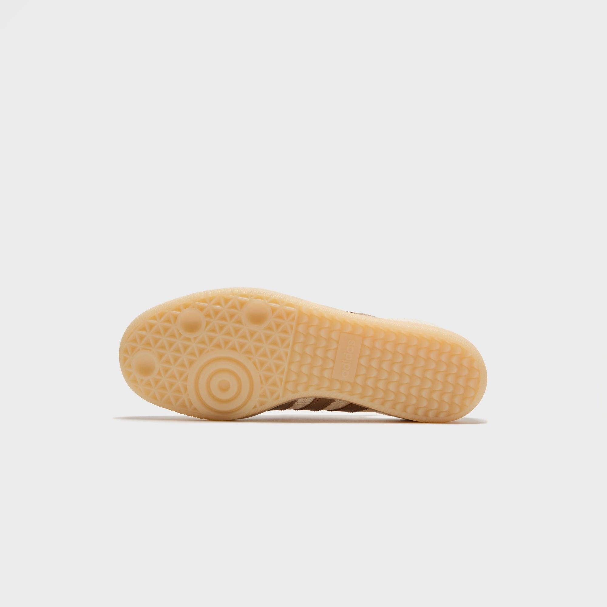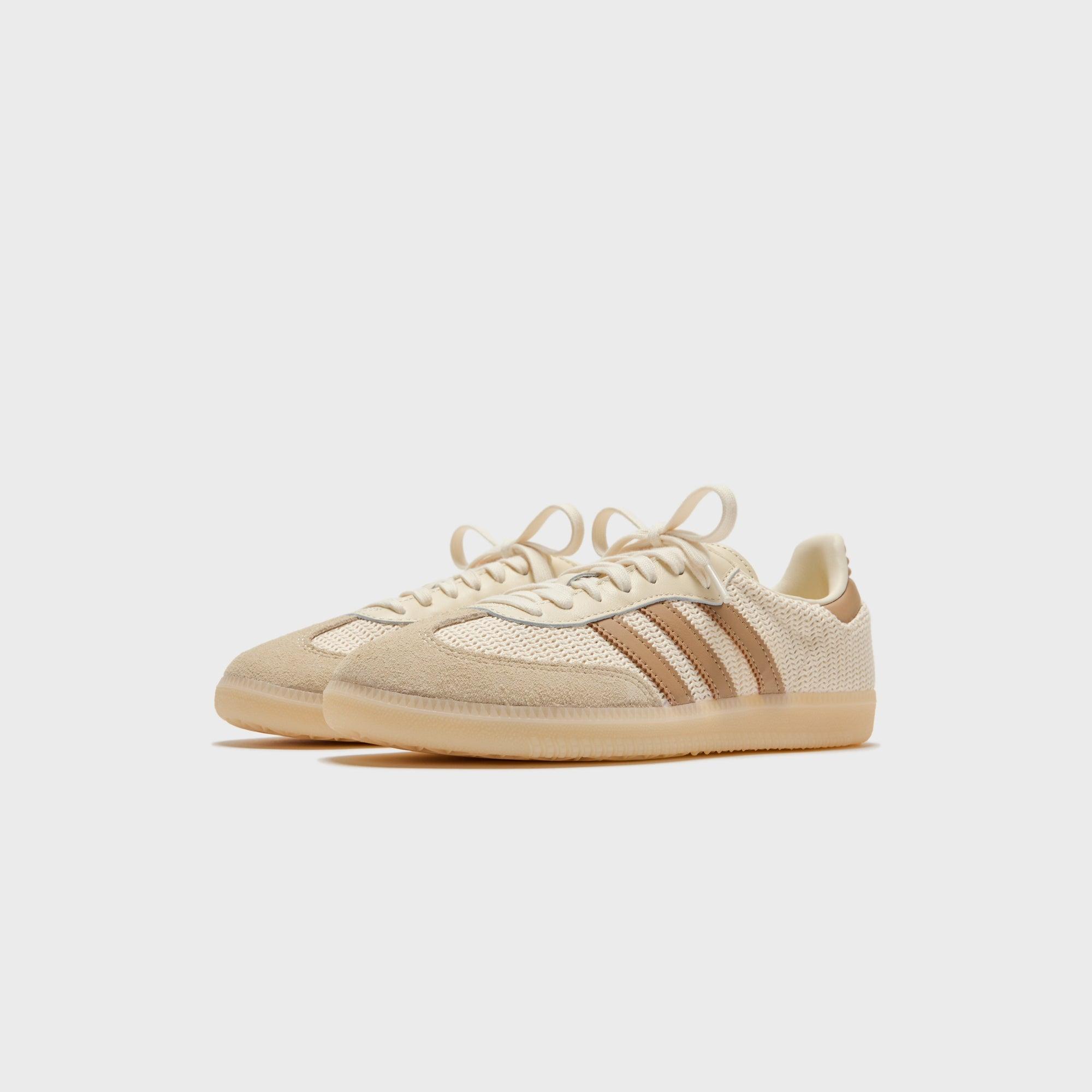 Samba OG silhouette Cotton mesh upper Suede overlays Padded collar adidas logo branding on tongue Leather Tri-Stripe branding at lateral sides Flat woven laces Leather heel counter Gum rubber outsole Style: aaji3185 Color: Cream White / Cardboard / Crystal Sand Material: Cotton mesh / Suede