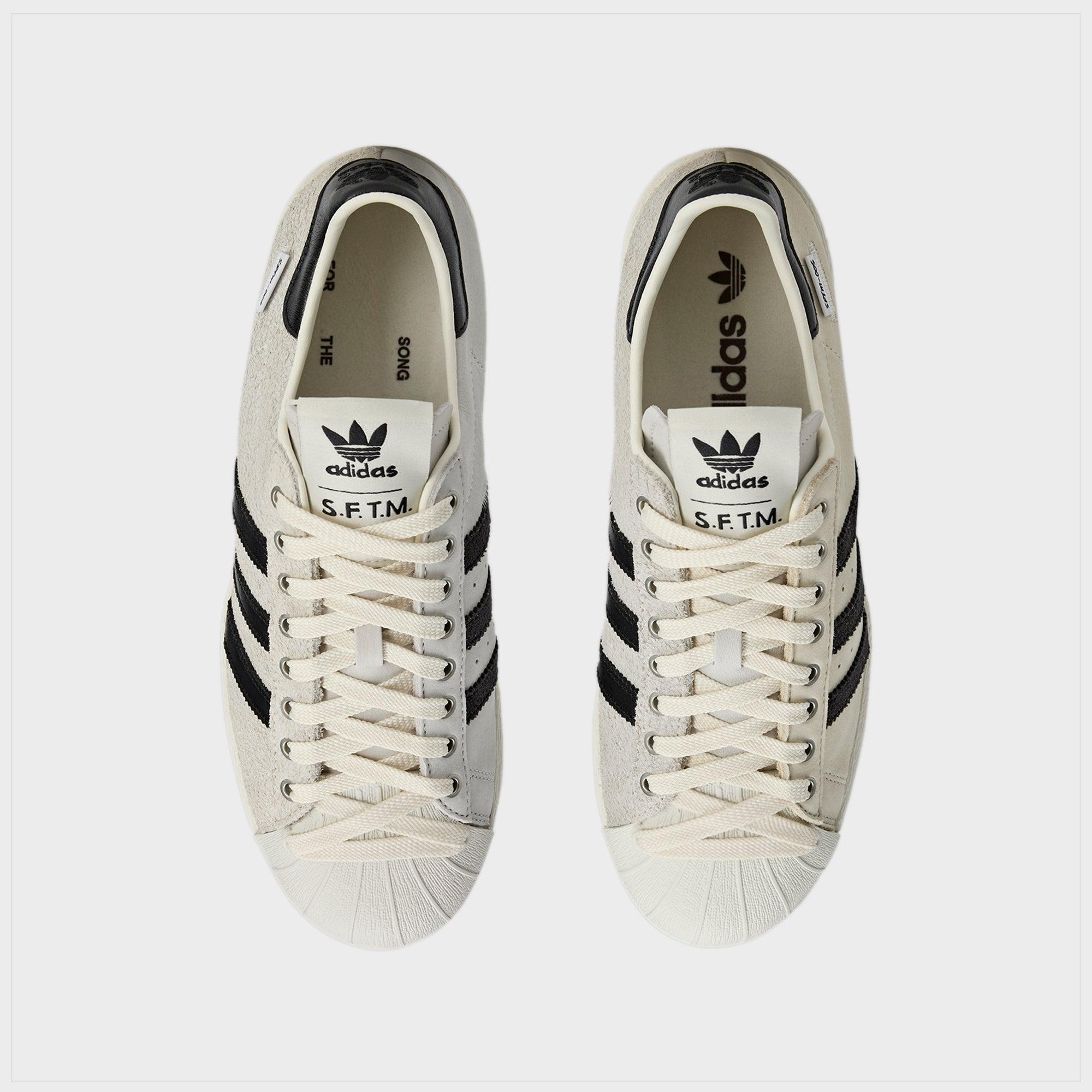 Superstar 82 SFTM silhouette Suede upper Padded collar Shell toe Metal eyelets Branded tongue Leather Tri-Stripes at lateral side Logo tag at lateral ankle Flat woven laces adidas branding at heel Rubber outsole Style: aajq0958 Color: White Material: Leather / Suede