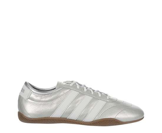 adidas Grand Court Lo Womens Sneaker - Silver/White Clean and sleek is the look with the Grand Court Lo womens Sneaker from adidas. Featuring a soccer-cleat inspired upper with stitched detailing and bold signature 3-Stripes for extra style, this low-profile Shoe goes wherever you do. The footbed keeps you comfy, while the raised outsole provides stability and a cool aesthetic whatever the activity. Leather upper Lace-up closure Signature 3-Stripes Cushioned footbed Gum Rubber outsole