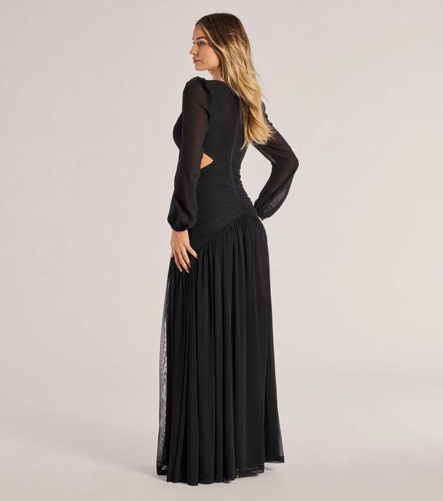 Special OccasionShowcase stylish sophistication in the Adley dress accented with chic details on mesh fabric that are sure to turn heads at your next formal affair. It features a plunging V-neckline for an alluring look, sheer long balloon-style sleeves, asymmetric cutouts at the waist, a ruched drop waist design, and a floor-sweeping pleated A-line silhouette.Fit & FeaturesSheer mesh fabric with partial liningPlunging V-necklineSheer long balloon sleeves with cinched hemsBack zipper closureAsymmetric waist cutouts, ruched drop waistFloor-length pleated A-line silhouetteRuns true to size