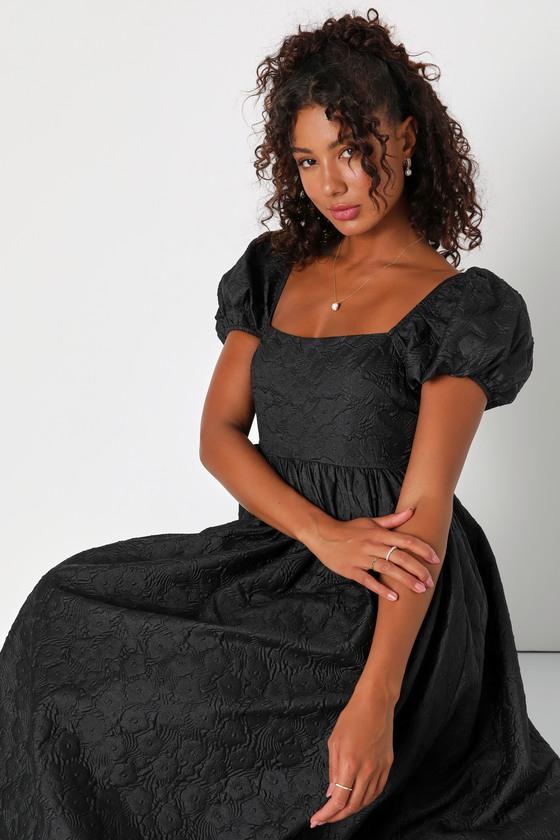 Be a doll and arrive at your next event in the Lulus Adorable Mood Black Floral Jacquard Puff Sleeve Babydoll Dress! This sweet dress has a woven jacquard composition, with a floral motif throughout, that shapes a square neckline, a darted bodice, and puffy short sleeves with elastic at the shoulders and cuffs. The high waist sits atop an ultra-cute babydoll skirt that ends at a chic midi hem. Hidden back zipper/clasp.