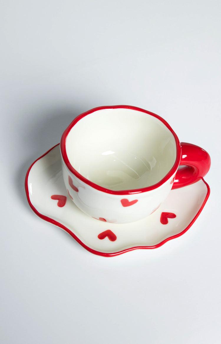 Red Heart Mug SetThis set is super cute coming into the festive season. Whether its a gift for a loved one or for yourself, it is perfect for a warm drink on a cold day.Features: White mug with red heart pattern White saucer with red heart pattern Ceramic material Glossy finish