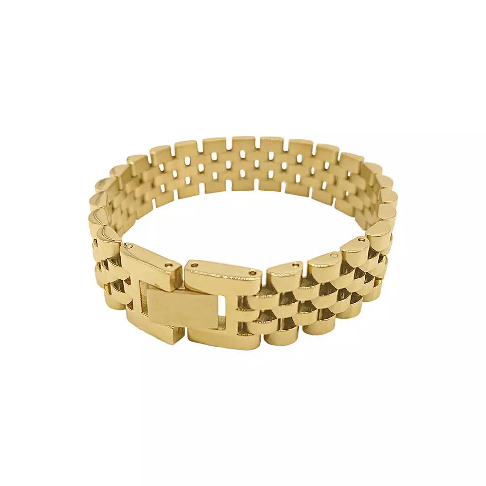 14K gold plated stainless steel creates a bracelet watch inspired band that adds unique style to your look. 7 length, 10mm width Foldover clasp 14K gold plated stainless steel Imported Adornia donates 10% of net profit to charities focused on female empowerment This product meets Nordstrom Give Back criteria: A portion of the proceeds benefits people, animals or the planet through charitable giving
