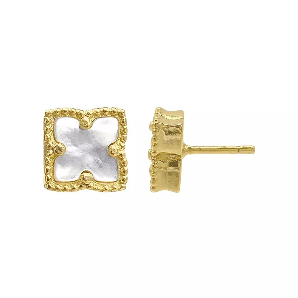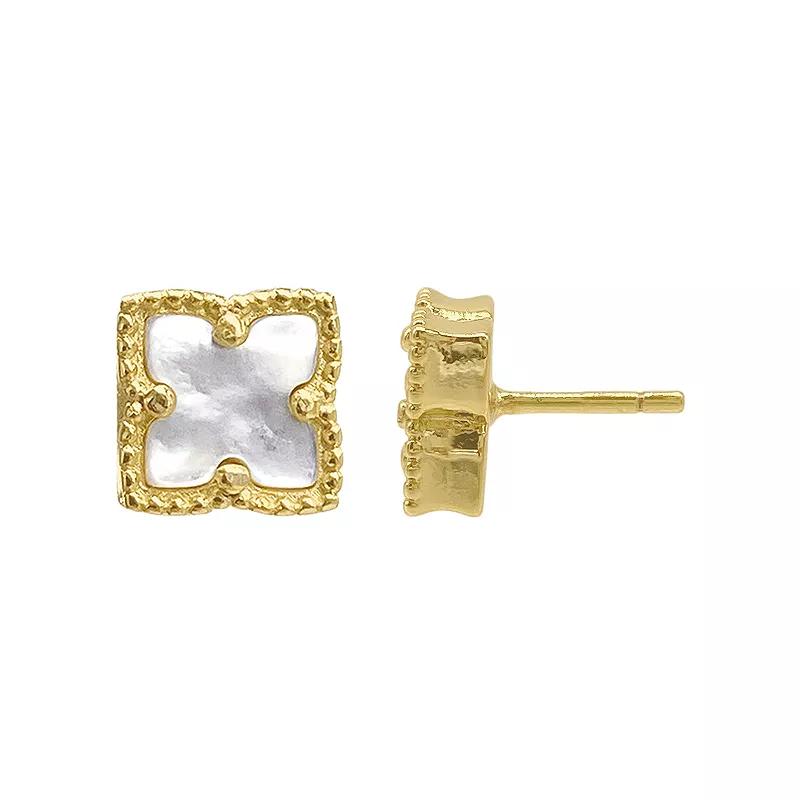 Mother of pearl insets create flower shaped stud earrings that shine with a 14K yellow gold or silver plating. 10mm length Post back 14K gold plated or silver brass/mother of pearl Imported Adornia donates 10% of net profit to charities focused on female empowerment This product meets Nordstrom Give Back criteria: A portion of the proceeds benefits people, animals or the planet through charitable giving