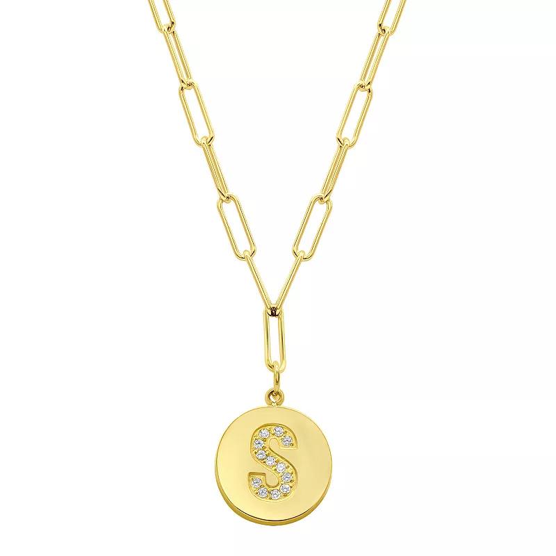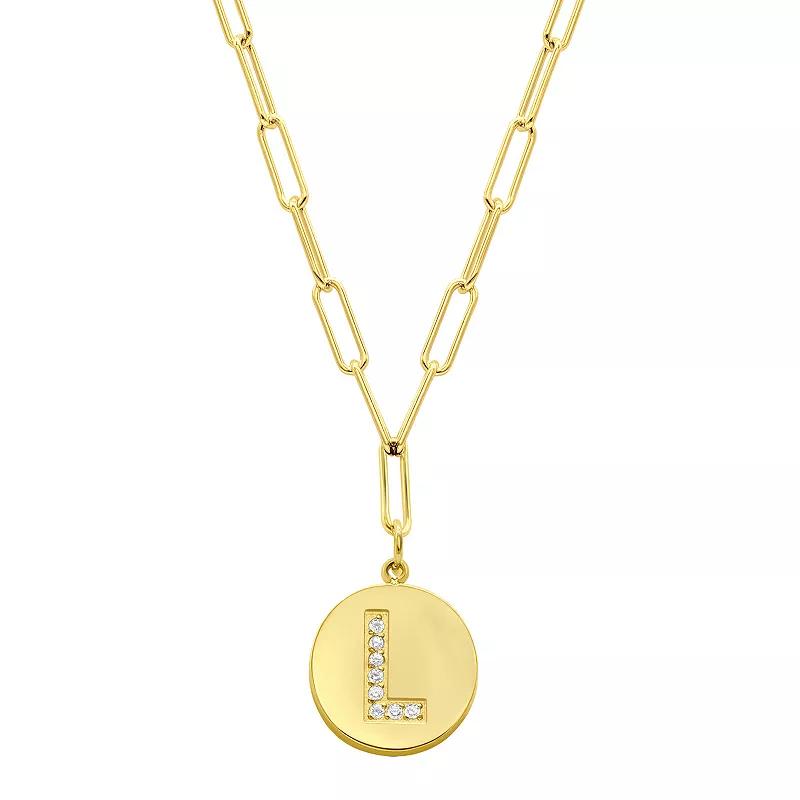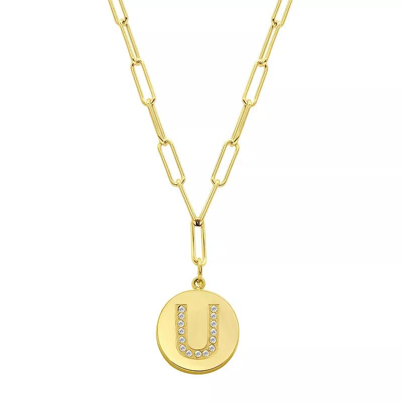 Personalize your style with this Adornia Gold Tone Adjustable Cubic Zirconia Initial Disc Pendant Paperclip Necklace. Click on this JEWELRY & WATCHES GUIDE to learn about fit, styles, materials and more! Personalize your style with this Adornia Gold Tone Adjustable Cubic Zirconia Initial Disc Pendant Paperclip Necklace. Click on this JEWELRY & WATCHES GUIDE to learn about fit, styles, materials and more! FEATURES Pendant size: 0.5L x 0.5W Chain length: 16 in. + 2-in. extender Chain type: link Clasp: lobster-claw Metal: stainless steel Plating: 14k gold Finish: polished Packaging: pouch Imported Nickel free Water resistantSTONE DETAILS Stone type: cubic zirconia Shape: round Setting: prong Size: 16-18 ADJ. Gender: female. Age Group: adult. Material: Gold Plate.