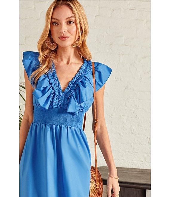 Adrianna by Adrianna Papell Ruffle V-Neck Smocked Waist Sleeveless Midi Dress