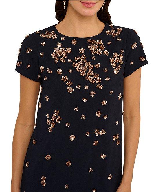 Adrianna Papell Beaded Crepe Crew Neck Cap Sleeve Shift Dress