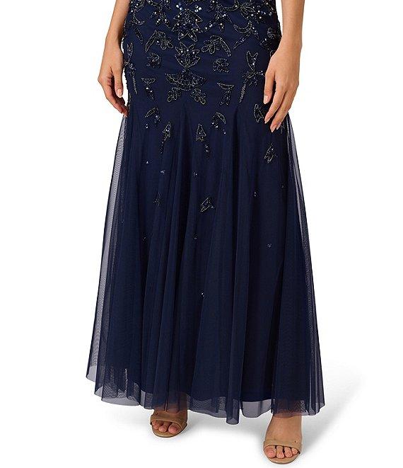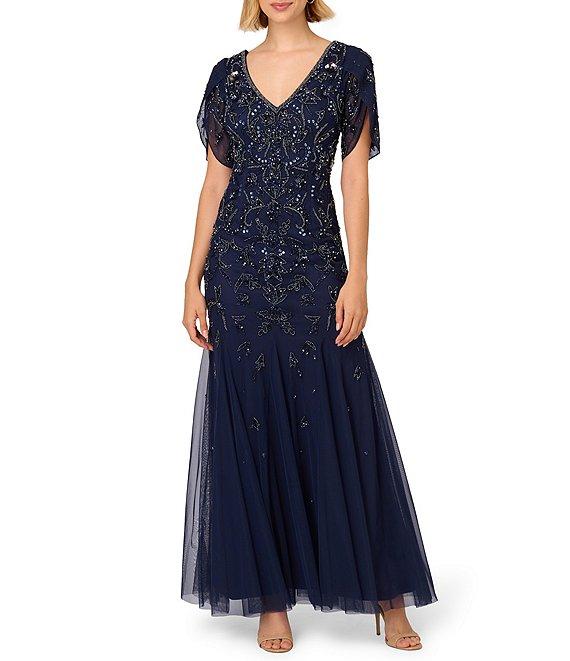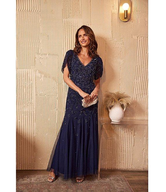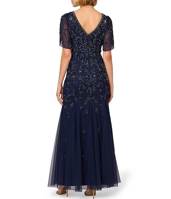 Adrianna Papell Beaded V-Neck 3/4 Petal Sleeve Mermaid Gown