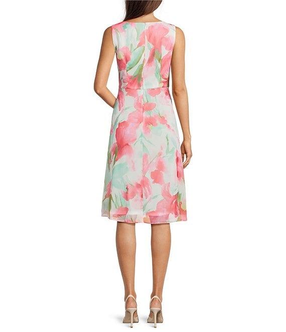 Adrianna Papell Chiffon Floral Print V Neck Sleeveless Front Drape A-Line Midi Dress