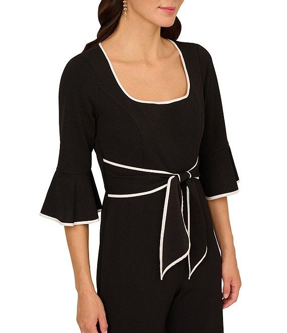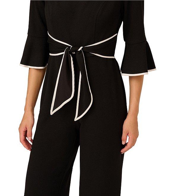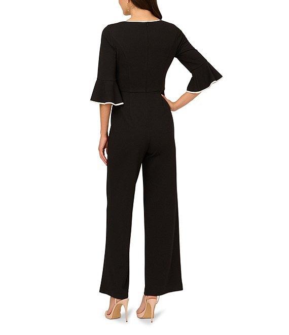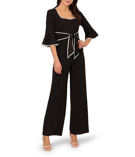 From Adrianna Papell, this dress features: Crepe fabrication Square neckline 3/4 ruffle sleeves Contrast piping Jumpsuit silhouette Straight leg pant Lined Center back zipper closure Approx. 32.5" in length from inseam Polyester/elastane Dry clean Imported.