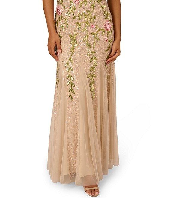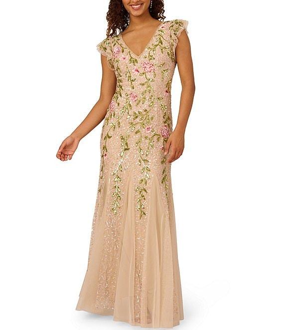From Adrianna Papell, this dress features: Floral beaded mesh fabrication V-neckline Flutter sleeves Zip back closure Approx. 62" length Polyester Dry clean Imported.