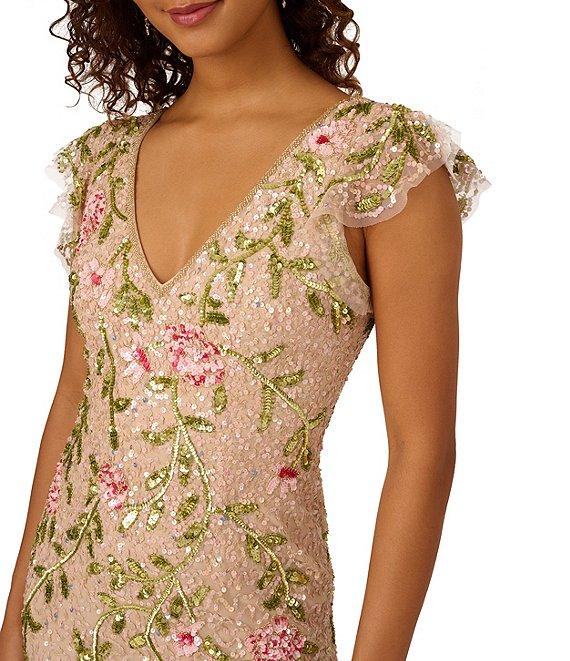 Adrianna Papell Floral Beaded Mesh V-Neck Flutter Sleeve Dress