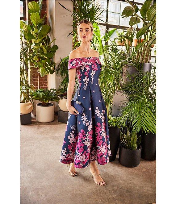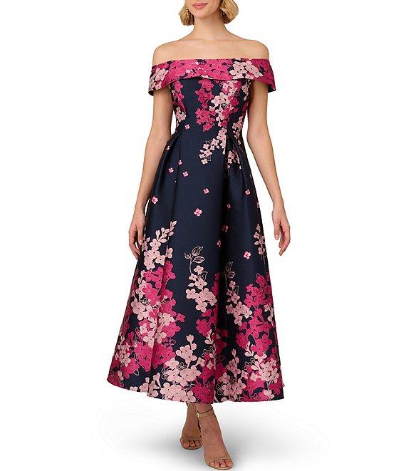 Adrianna Papell Floral Jacquard Off-the-Shoulder Fit and Flare Midi Dress