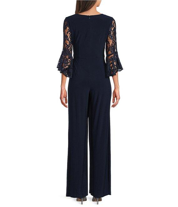 Adrianna Papell Lace Surplice Neck 3/4 Bell Sleeve Jersey Jumpsuit