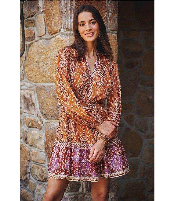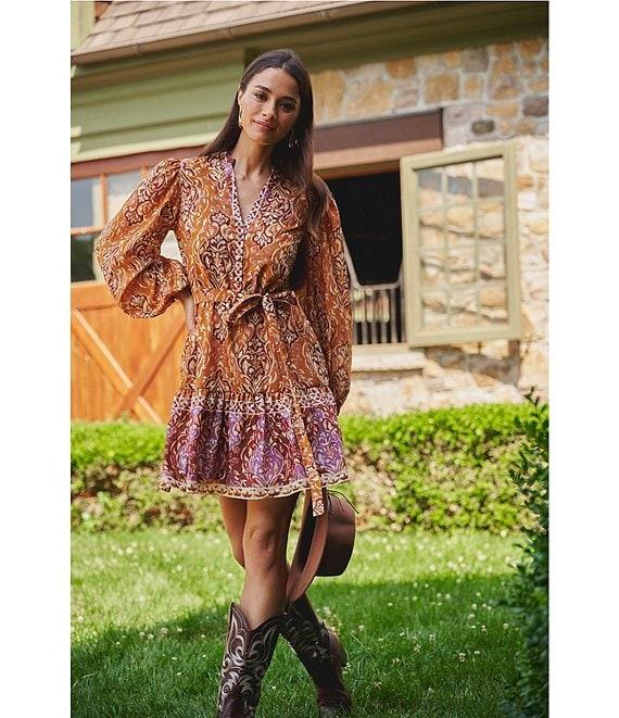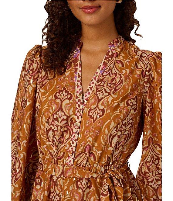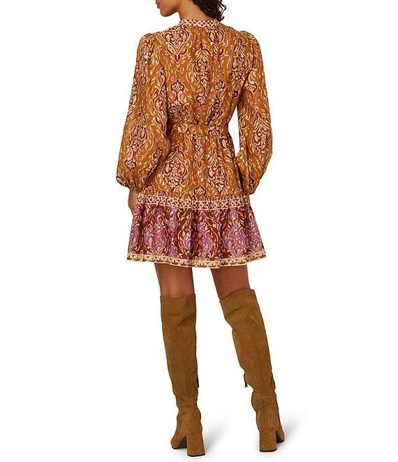 Adrianna Papell Long Sleeve V- Neck Tie Waist Printed Mini Dress