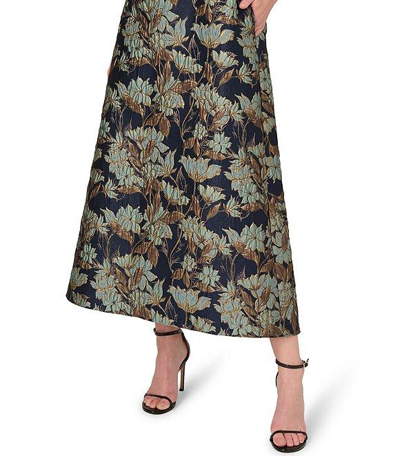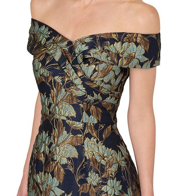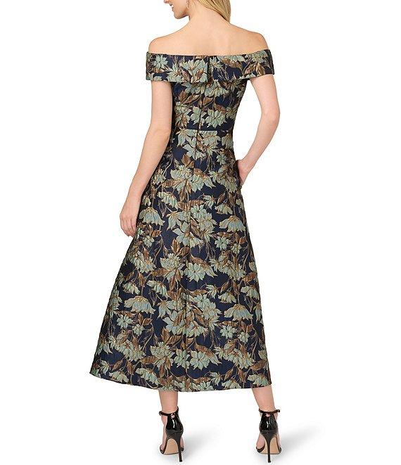From Adrianna Papell, this dress features: Jacquard fabrication Off the shoulder neckline Sleeveless Floral print A-line silhouette Metallic detail Lined Center back zipper closure Approx. 53" length from HPS Polyester/metallic Dry clean Imported.
