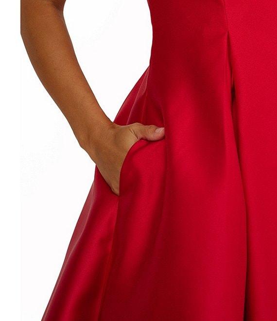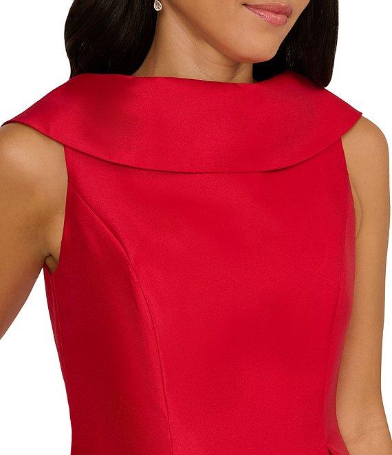 From Adrianna Papell, this dress features: Mikado fabrication Boat neckline Sleeveless Roll neckline Fit and flare silhouette Seam detail Center back zipper closure Approx. 46" in length from high point shoulder Polyester Dry clean Imported.