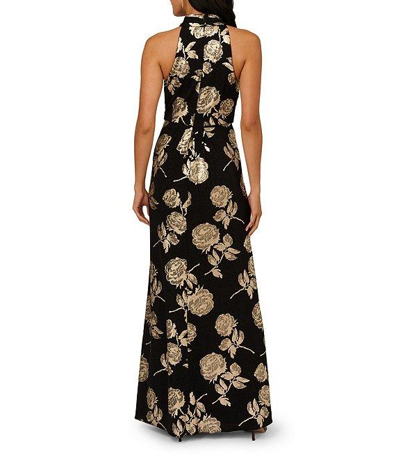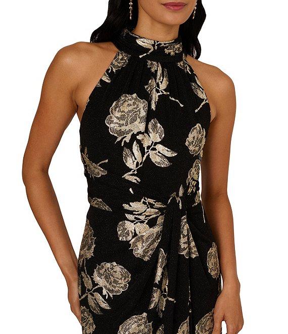 From Adrianna Papell, this dress features: Novelty knit fabrication Halter neckline Sleeveless Metallic floral print Gathered front Lined Center back zipper closure Approx. 62" in length from high point shoulder Polyester/elastane/metallic Spot clean Imported.
