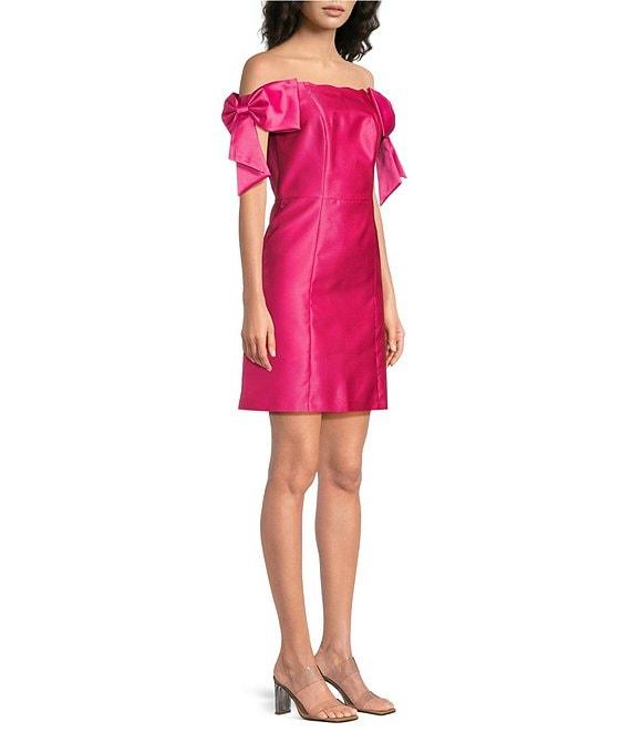 From Adrianna Papell, this dress features: Sheath silhouette Mikado fabrication Off the shoulder neckline with scallop detail Cap sleeves with bow detail Princess seams Waist seam Zip back closure Lined Approximate length 36" Polyester Dry clean Imported.