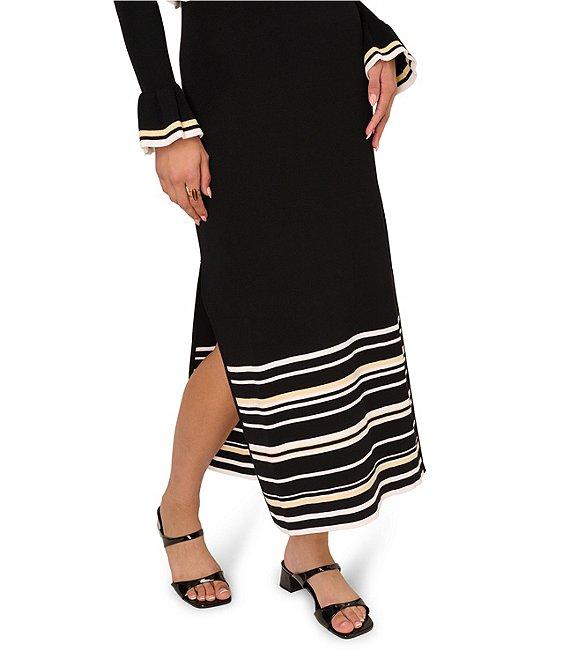 From Adrianna Papell, this dress features: Novelty knit fabrication Sheath silhouette Off-the-shoulder neckline Long sleeves with ruffle trim Stripes Pullover closure Approx. 54" length Polyester Hand wash Imported.