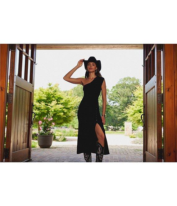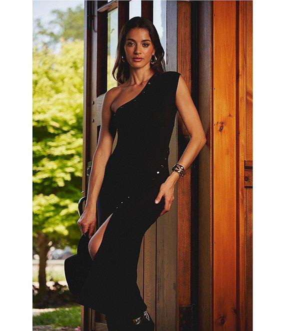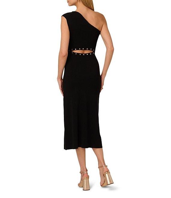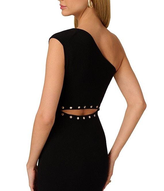 From Adrianna Papell, this dress features: Sweater knit fabrication Sheath silhouette One shoulder neckline One cap sleeve Studded embellishment on front Horizontal studded open back Side thigh slit Pullover Approx. 50" length Polyester/Elastane Hand wash Imported.
