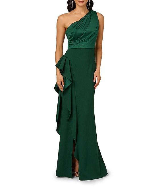 From Adrianna Papell, this gown features: matte jersey fabrication mermaid silhouette one shoulder neckline sleeveless cascading ruffle embellishment fully lined center zip back closure Approx. 62" in length from shoulder to hem polyester dry clean Imported.