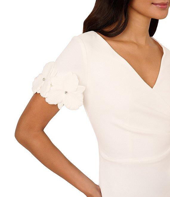 From Adrianna Papell Petite, this dress features: Crepe fabrication V-neckline Short sleeves Sheath silhouette Lined Floral details on sleeves Zip back closure Approx. 39" in length from HPS Polyester/elastane Dry clean Imported.