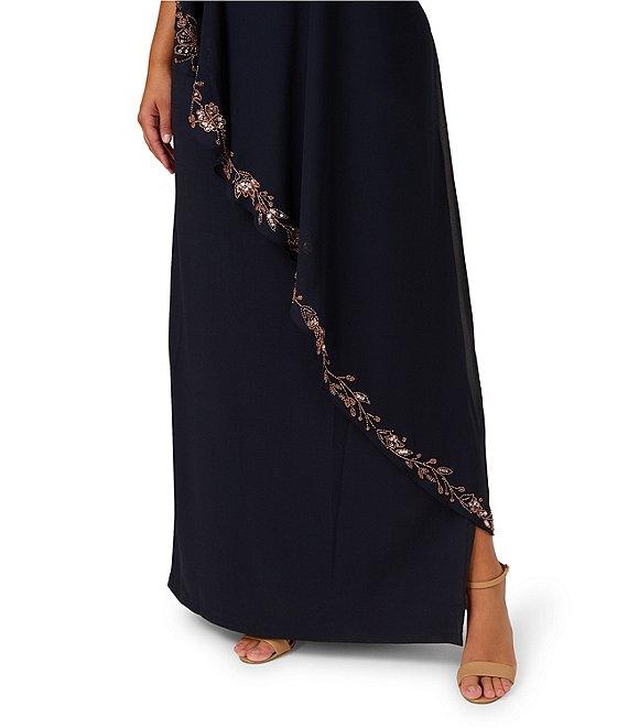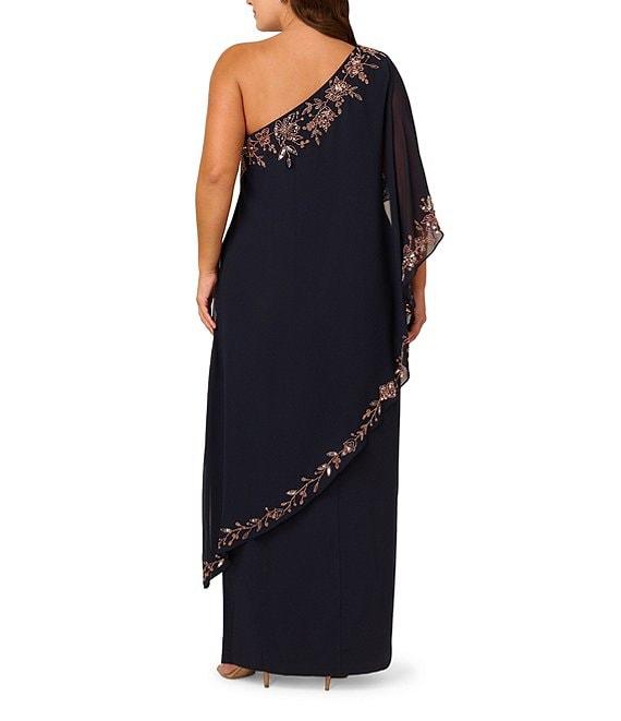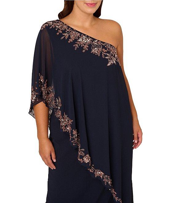 From Adrianna Papell Plus, this gown features: Chiffon fabrication One shoulder neckline Elbow length singular sleeve Sheath silhouette with asymmetrical overlay Lined Beaded trim on overlay Side zipper closure Approx. 61.5" in length Polyester Spot clean Imported.