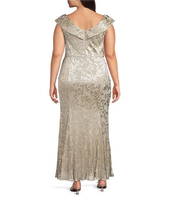 From Adrianna Papell, this dress features: Novelty fabrication Off the shoulder neckline Short sleeve fold over sleeves Metallic foil floral print Lined Mermaid silhouette Center back zipper closure Approx. 62" in length from high point shoulder Polyester/metallic Spot clean Imported.