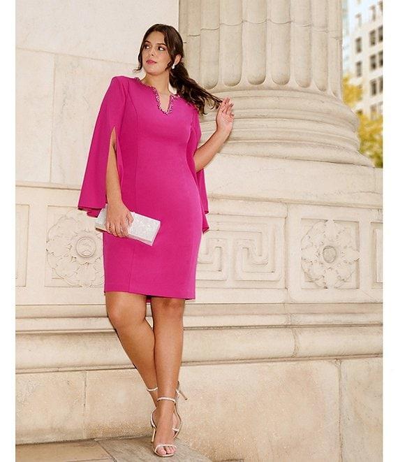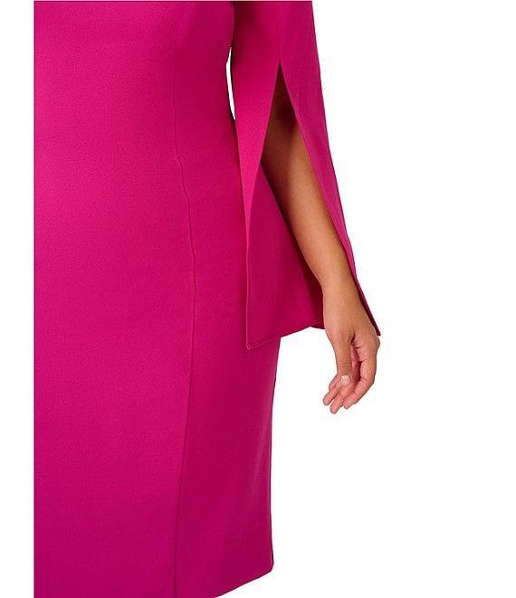 From Adrianna Papell Plus, this dress features: Crepe fabrication Sheath silhouette Slit v-neckline Long sleeves with slit cuffs Jewel embellished detail Fully lined Straight hemline Center back zip closure Approx. 41" length Polyester/elastane; lining: polyester Dry clean Imported.