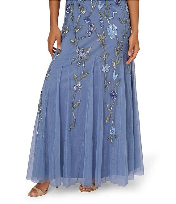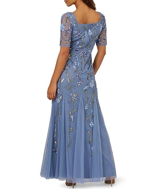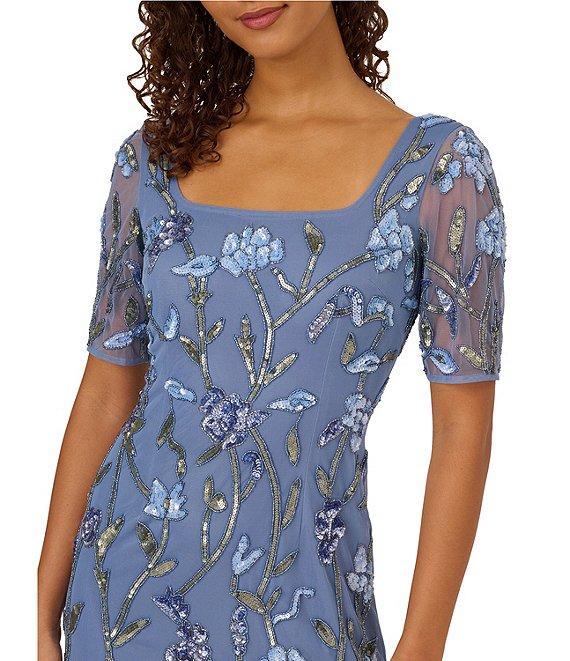 Adrianna Papell Square Neck Floral Beaded Short Sleeve Crew Neck Mesh Gown