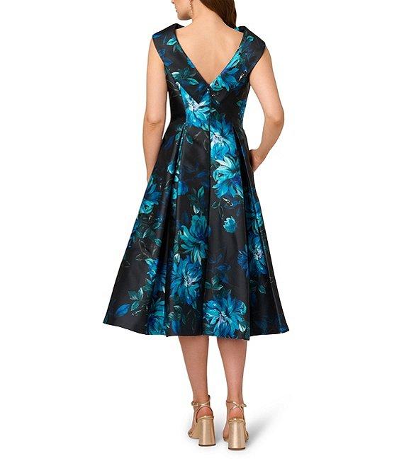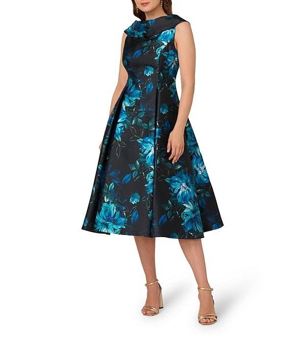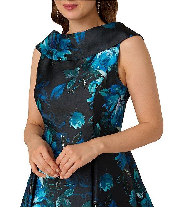 From Adriana Papell, this dress features: Taffeta fabrication Roll neckline Sleeveless Lined Pockets Stretch Floral print Back zipper closure Approx. 46" in length from high point shoulder Polyester Dry clean Imported.