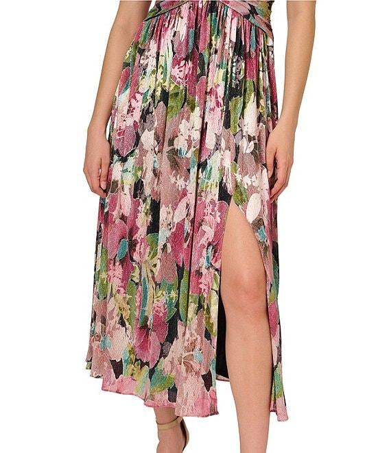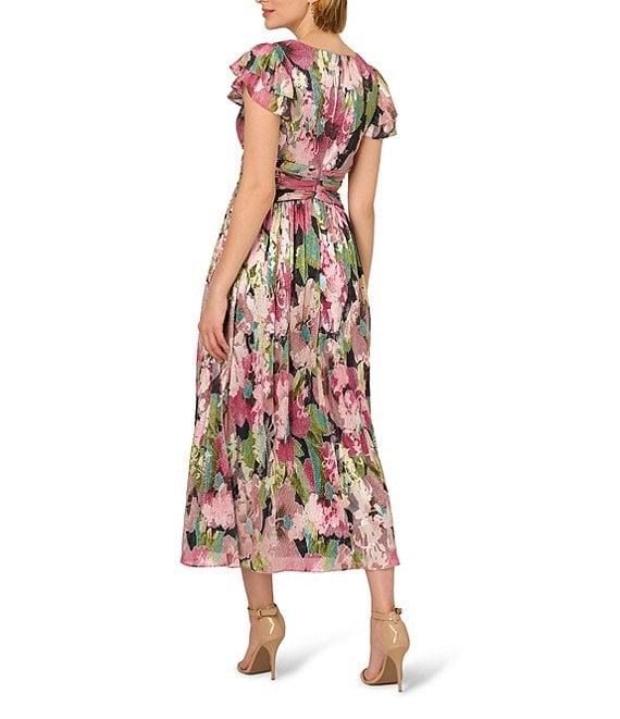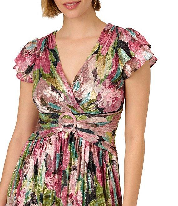 From Adrianna Papell, this dress features:A-line silhouetteMetallic crinkle chiffon fabricationFloral motifV-necklineCap flutter sleevesEmpire waist with shirringFront slitZip back closureLinedApprox. 53" length Polyester/metallicSpot cleanImported.