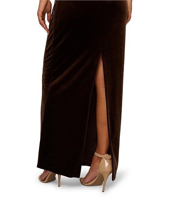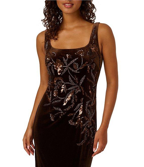 From Adrianna Papell, this dress features: Velvet fabrication Square neckline Sleeveless Floral beaded upper bodice Lined Center back zipper closure Approx. 61" in length from high point shoulder Polyester/elastane Spot clean Imported.
