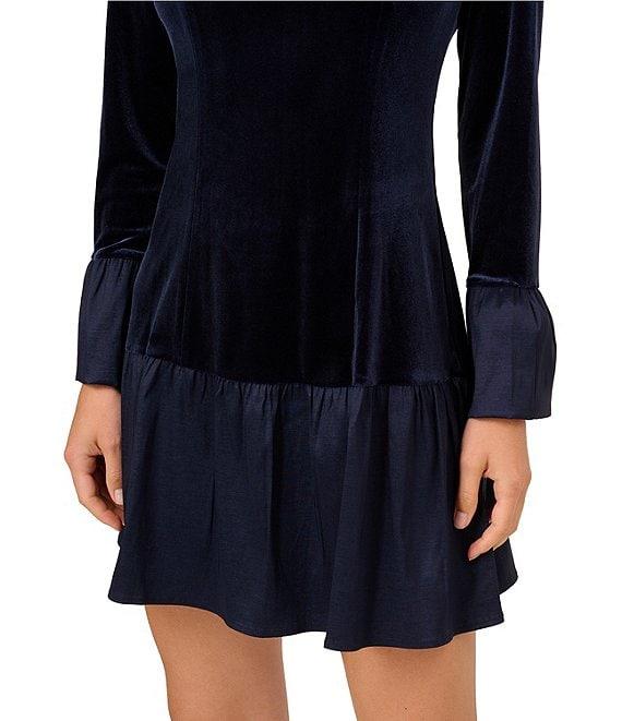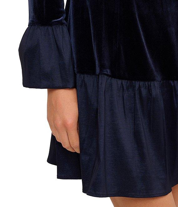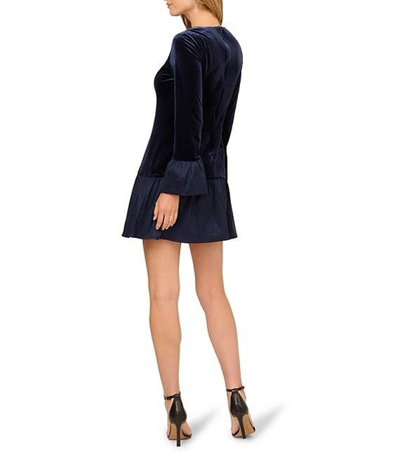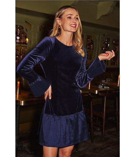 From Adrianna Papell, this dress features: Velvet fabrication Boat neckline Long sleeve Combo flounce silhouette Wrist cuff bell sleeve Lined Pull on construction Approx. 37.75" in length from high point shoulder Polyester/elastane Dry clean Imported.