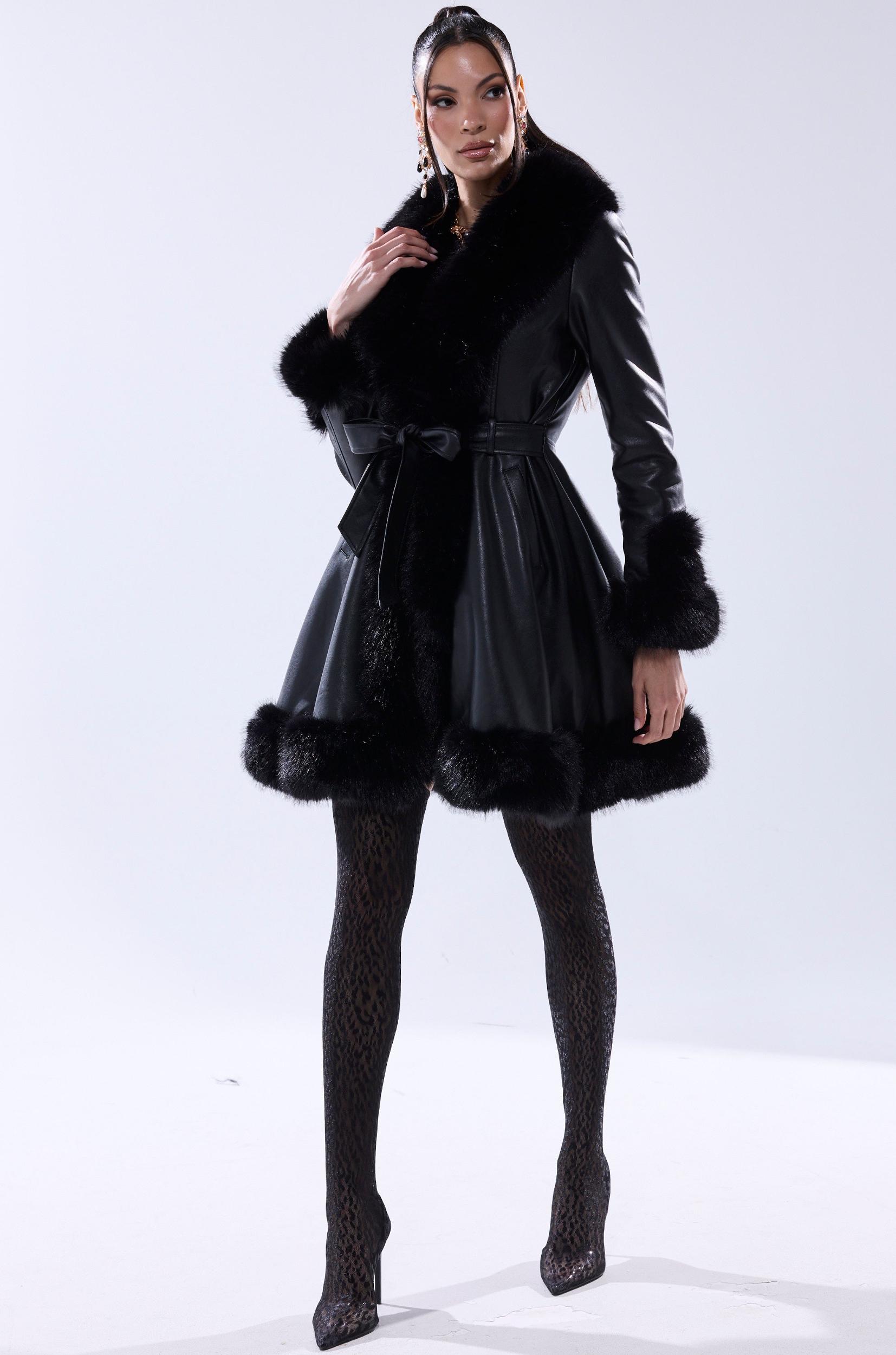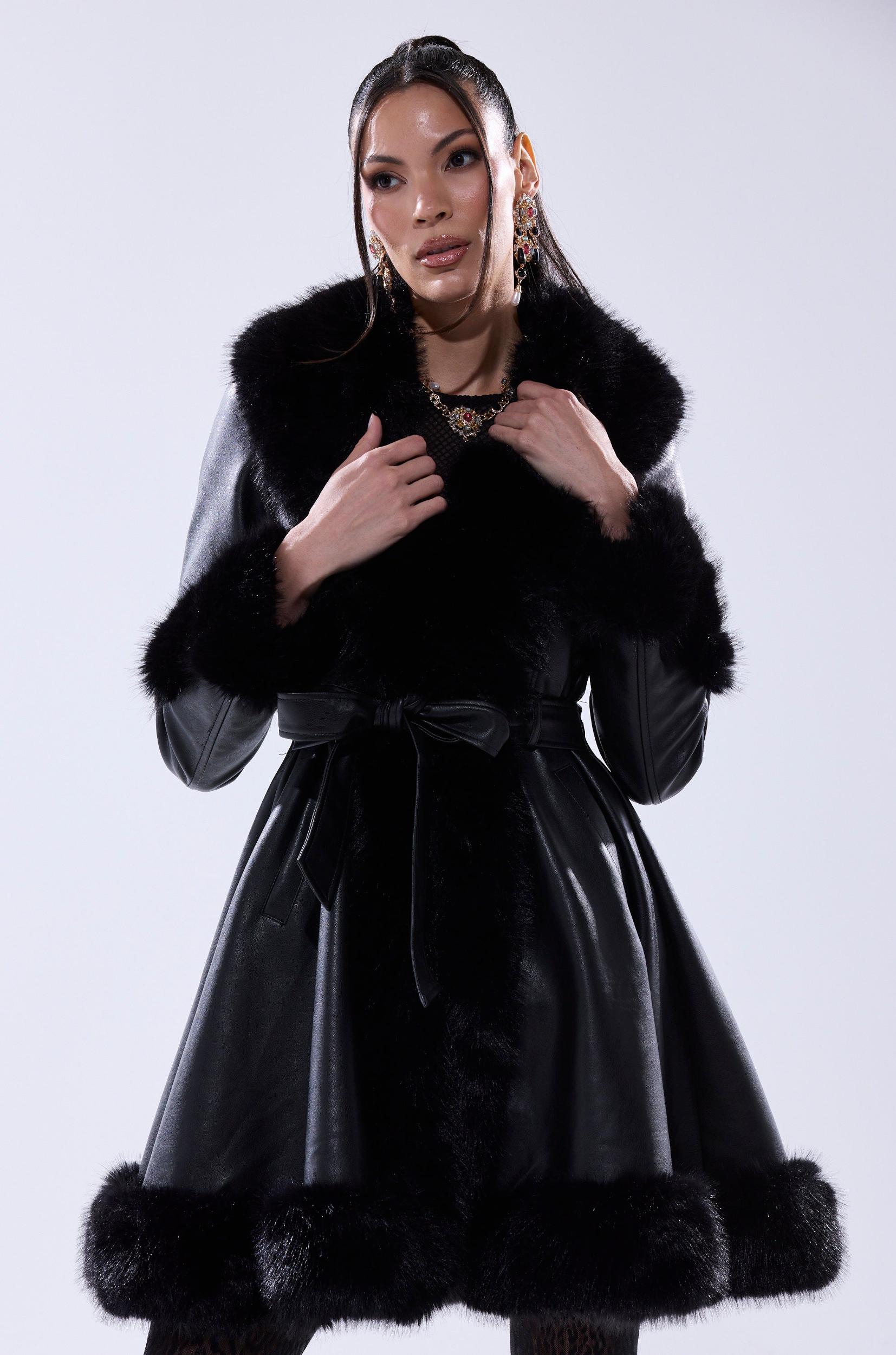 Conquer the cold in The AKIRA Label Adrienne Fur Trim Coat. Crafted from buttery smooth faux leather, this classy jacket features tonal, plush faux fur trim lining the hemlines including the oversized collar, long sleeves with fur cuffs, a coordinating leather self-tie waist belt, welted waist pockets, concealed front hook-and-eye closures, and an ultra-cozy faux fur lining for added insulation. Complete with a longline, fit-and-flare silhouette that cinches the waist for a flattering fit. Whether layered over an evening dress or paired with boots for daytime drama, this coat is the definition of statement outerwear. - Fabric: 67% PU 20% Polyester 13% Viscose, Fur: 100% Polyester- Spot Clean Only- No Stretch- Imported (all measurements approximate from size small)- 36” Shoulder to Hem- 15” Shoulder to Shoulder- 25” Sleeves- Model is 5’11” and is wearing size smallProduct ID: 1061199