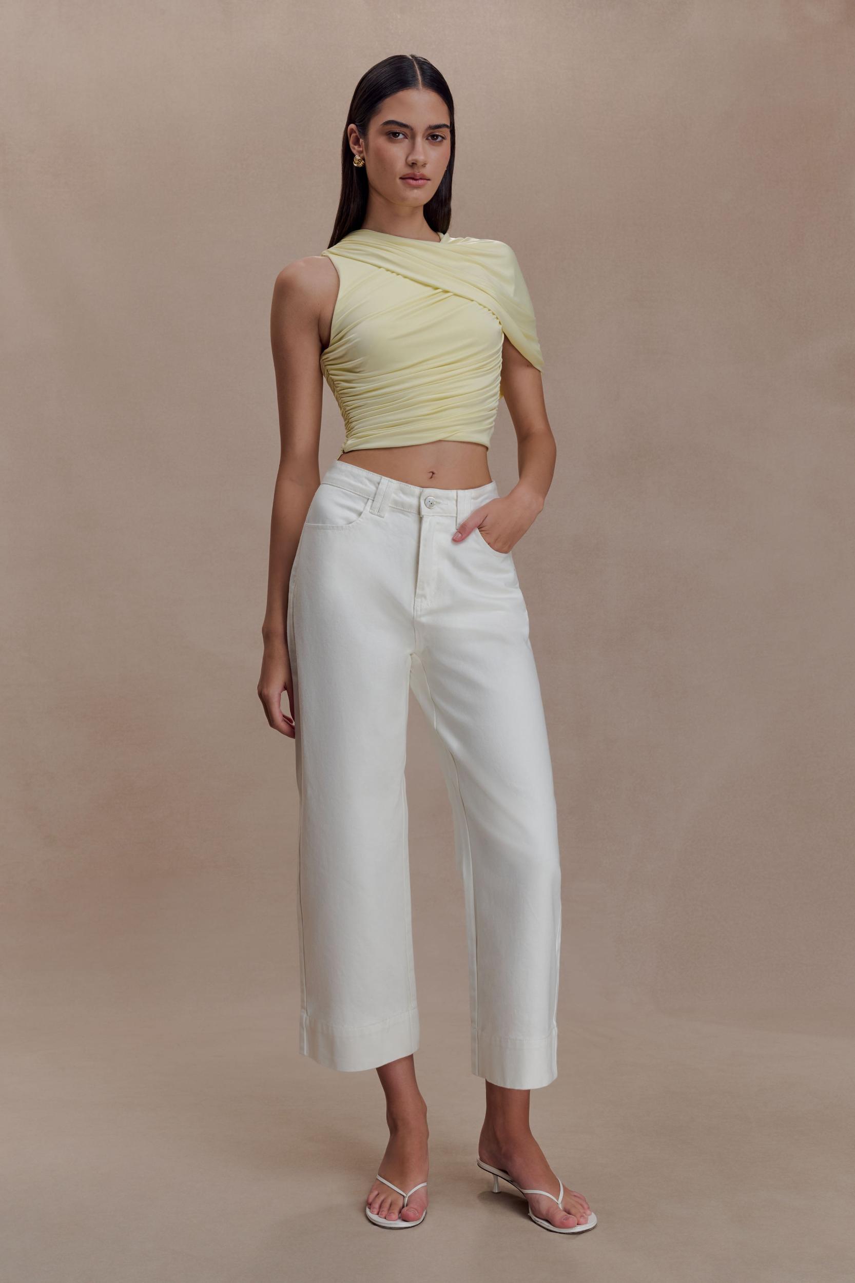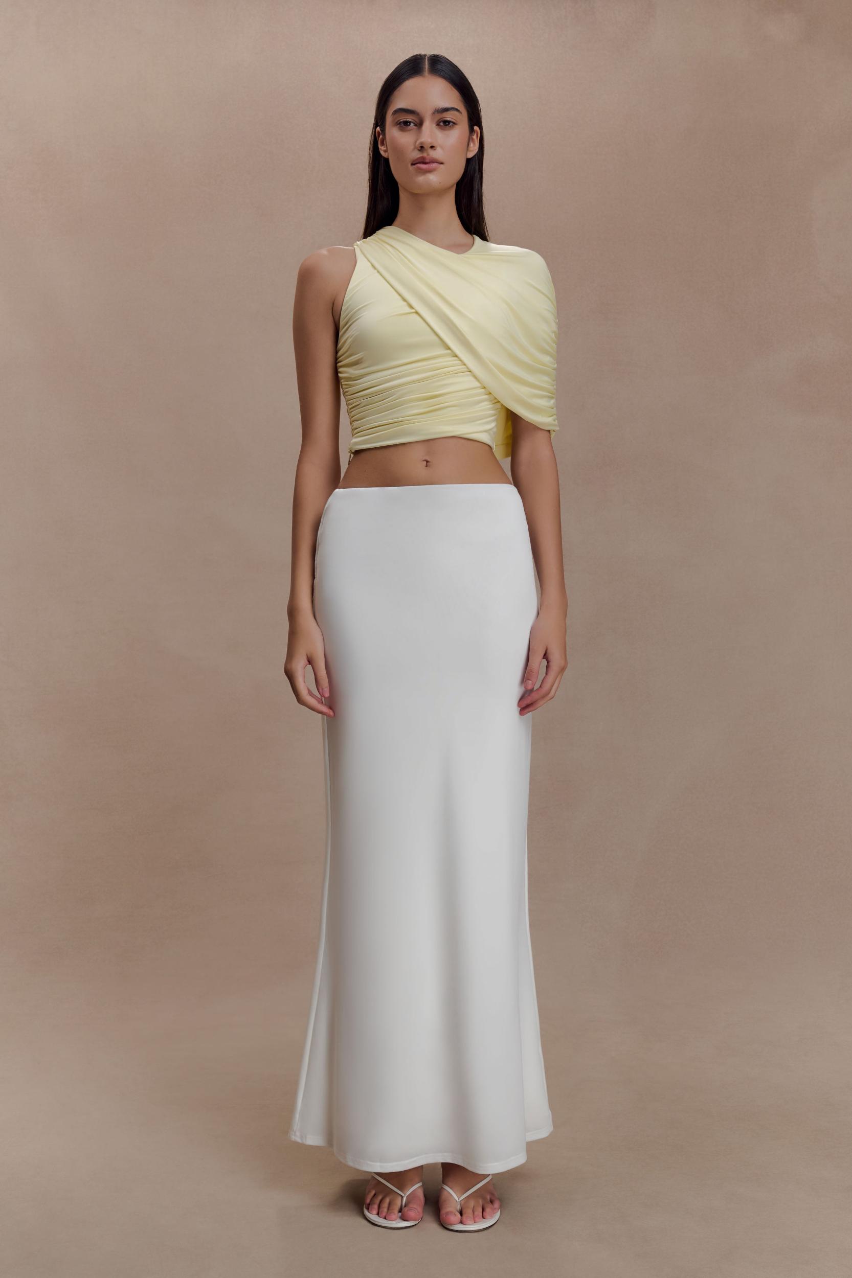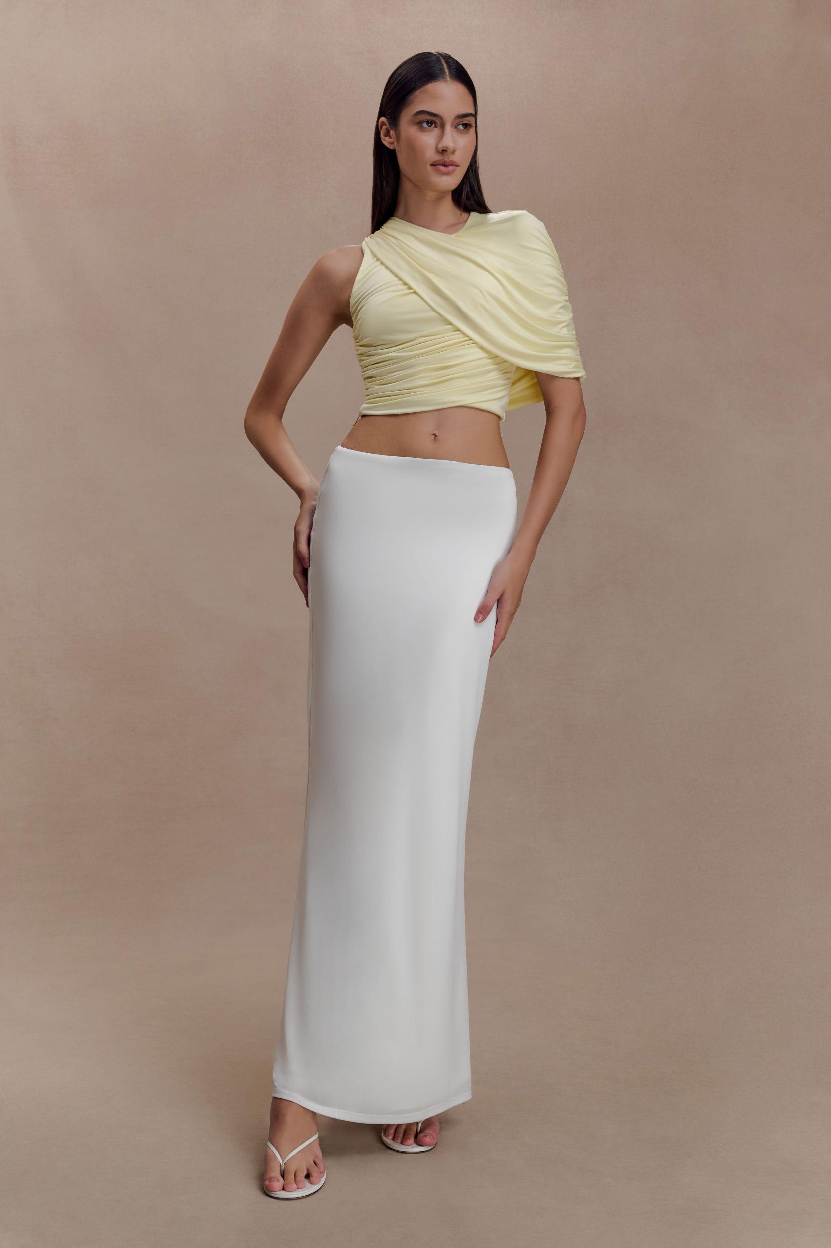 Fluid lines, defined. The ADRIENNE One Shoulder Slinky Top brings modern elegance to a softly contoured silhouette. Designed with a curved neckline and a twisted one-shoulder overlay, it creates a striking asymmetric shape that feels both directional and refined. The gathered bodice enhances the fitted form, offering flattering texture through the waist and bust. Fully lined for a smooth finish and secured with a back neckline button closure, this top delivers effortless polish with a fluid, after-dark sensibility.