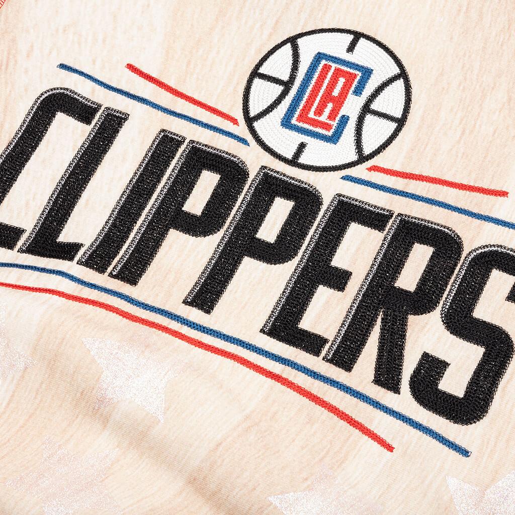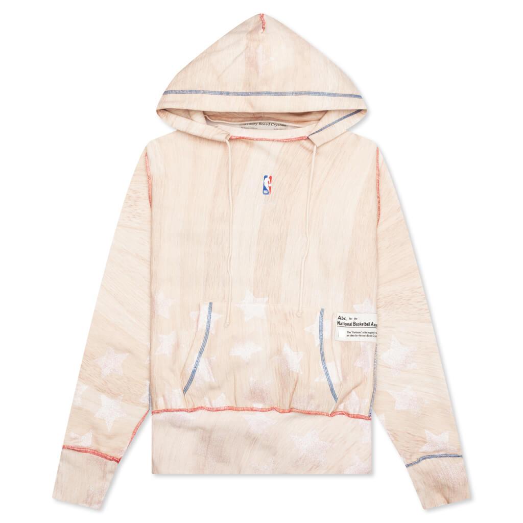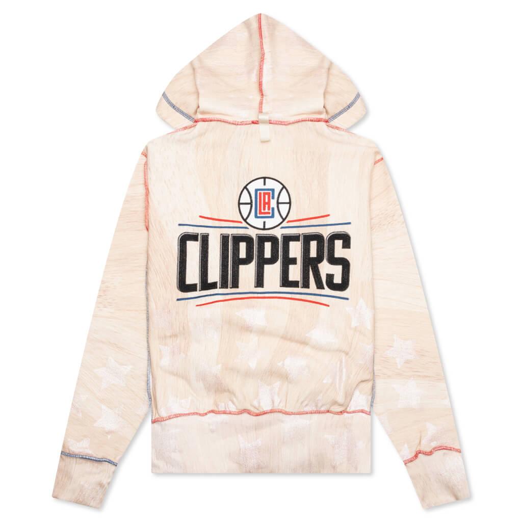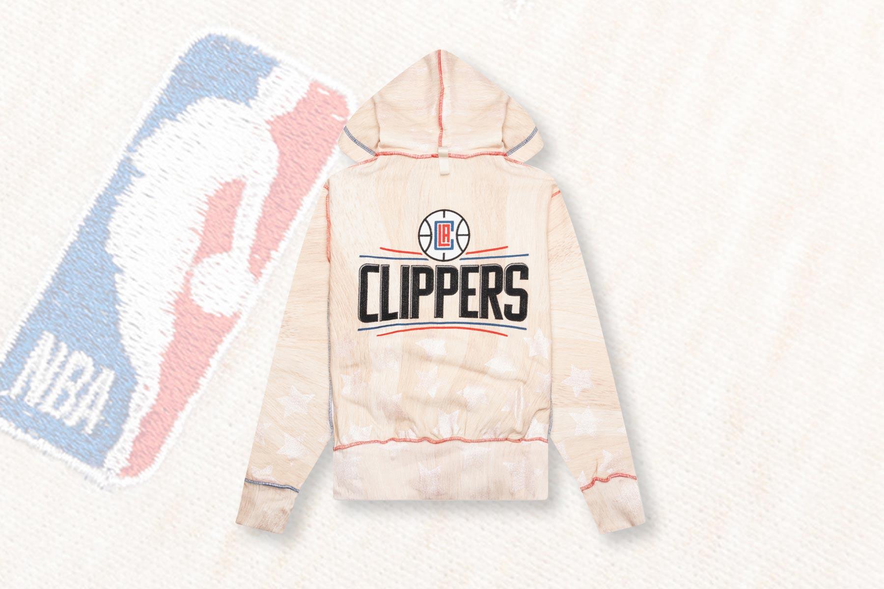 Advisory Board Crystals teams up with the NBA to create a collection of hoodies representing various teams. The garment is cut from cotton and has an all-over print that resembles a wooden basketball court. It includes an adjustable drawstring hood and boasts an inside-out athletic construction with exposed seams and contrast stitching that match the NBA's colors. Embroidered LA Clipper's branding can be seen on the back, and an ABC woven tag is placed near the kangaroo pocket. The signature pull tab on the back neck completes the design.DUE TO THE LIMITED NATURE OF THIS PRODUCT, ALL SALES ARE FINAL. THIS ITEM IS NOT ELIGIBLE FOR DISCOUNTS OR SPECIAL PROMOTIONS. Cotton blend Hooded collar Adjustable drawstring All over print Inside-out construction Exposed stitching Ribbed trims Style No: ABCXCLIPPERS