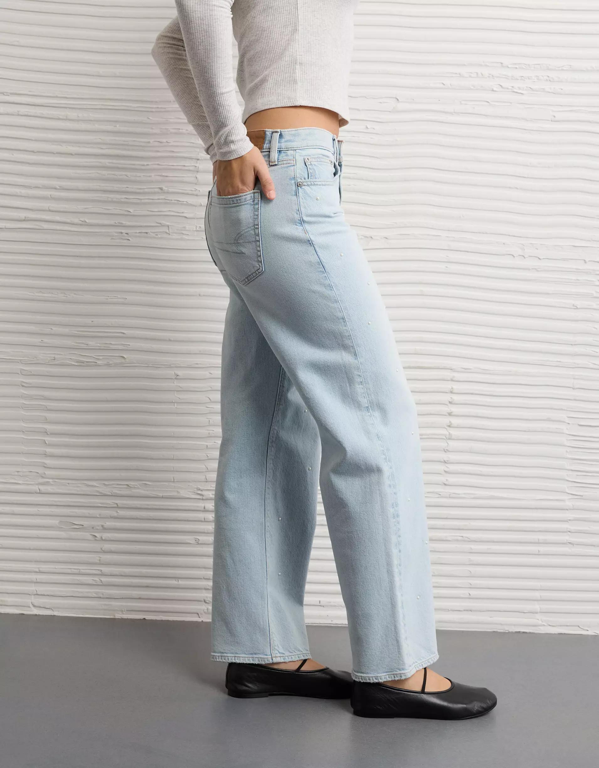 The it fit you need, with a high rise and wider leg from the thigh through the ankle. This style features femme pearl details!