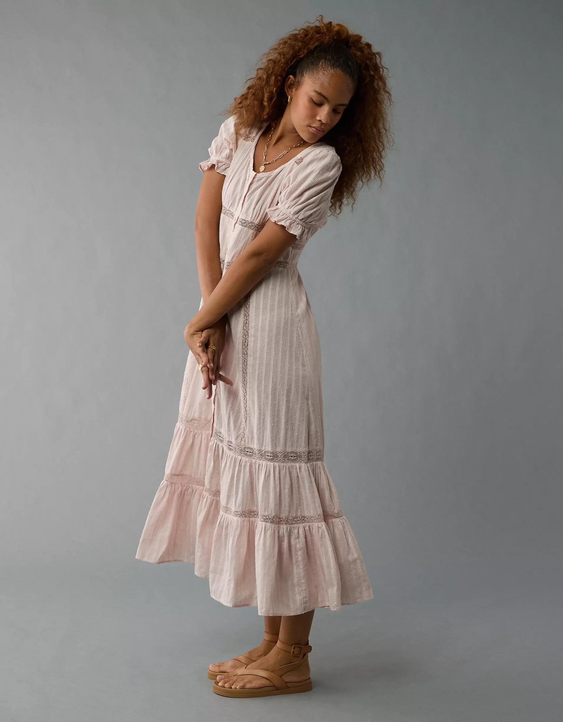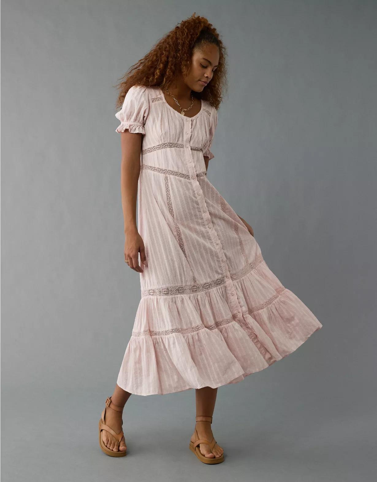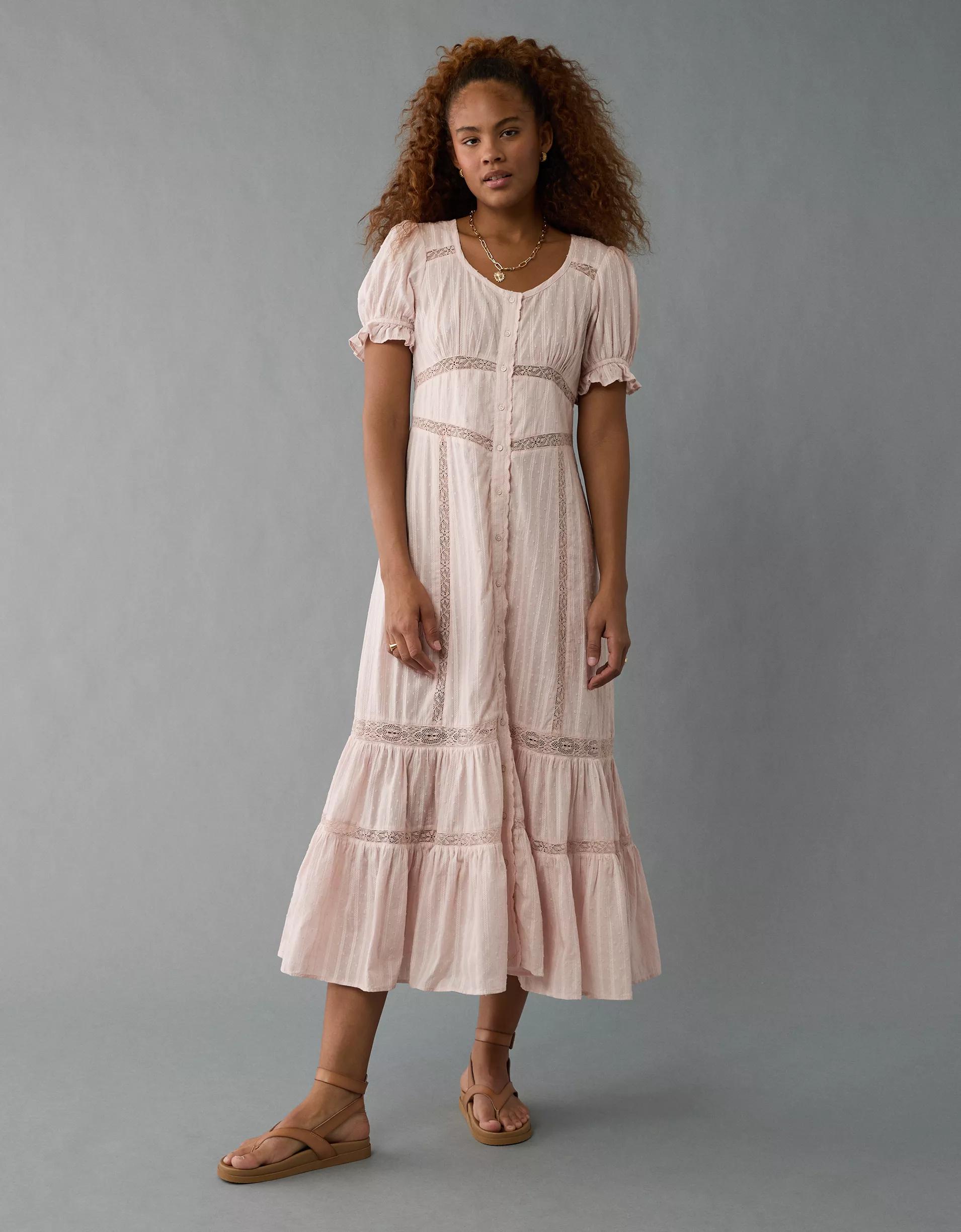AE Lace Puff-Sleeve Button-Up Midi Dress