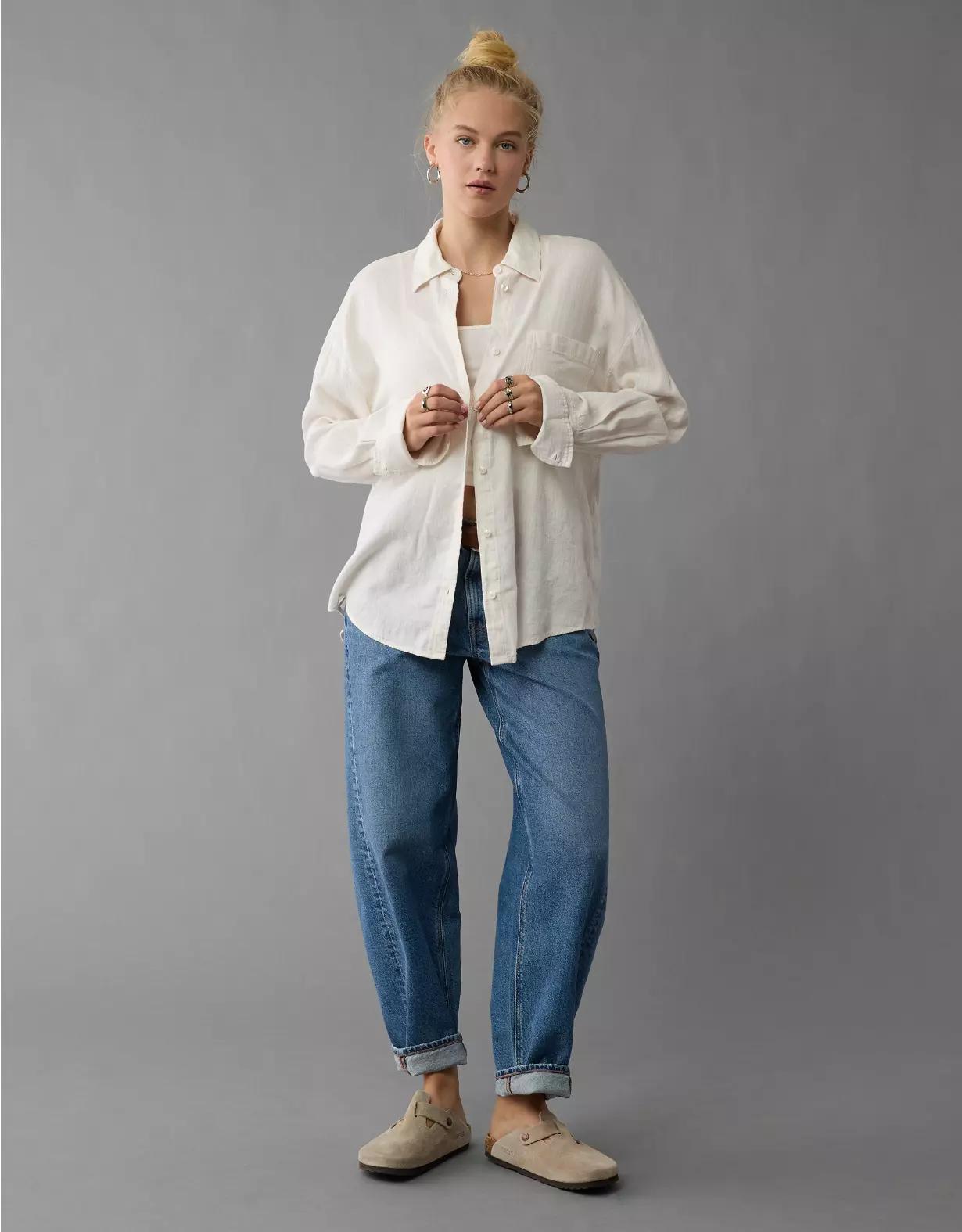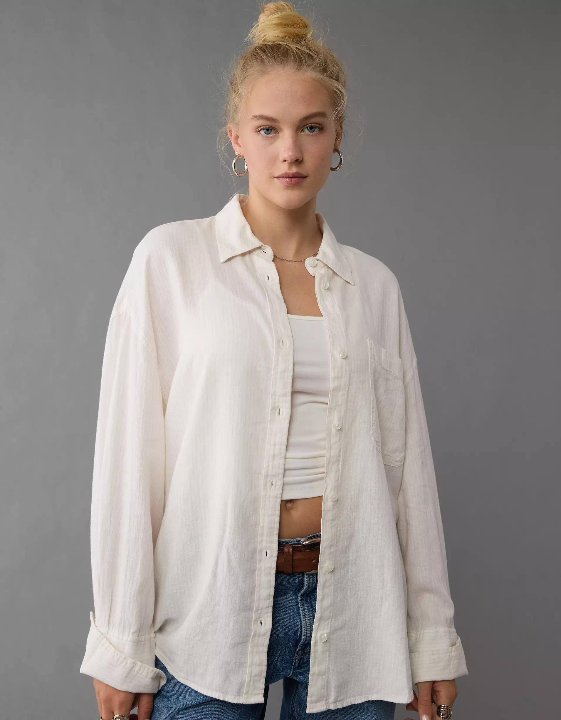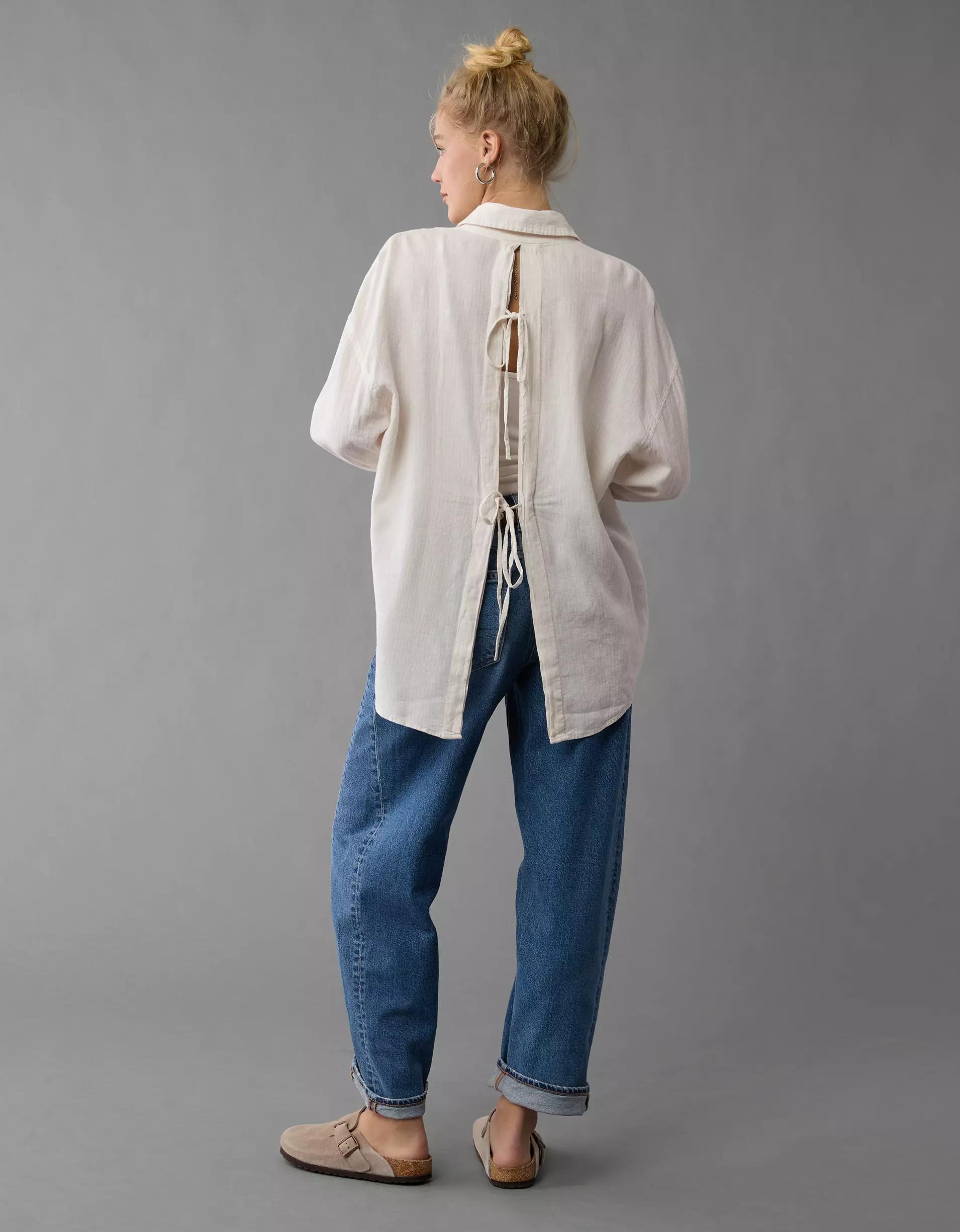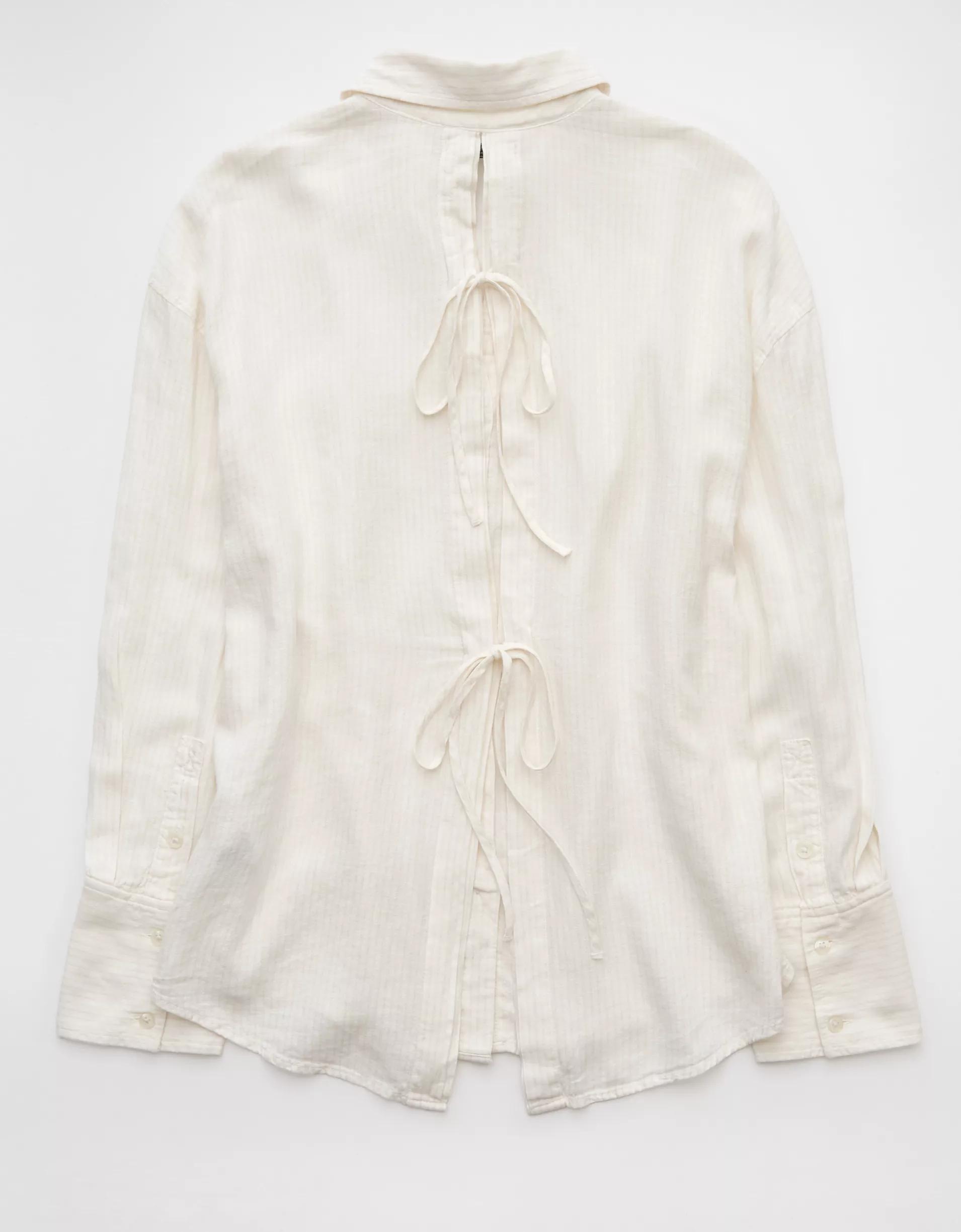 AE Linen-Blend Long-Sleeve Tie Back Button-Up Shirt