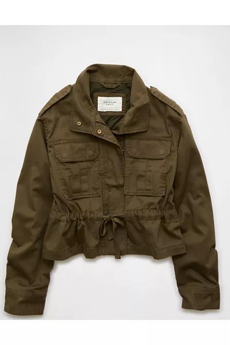 Structured twill fabric/Mock neck/Zip-up front with storm placket/Utility pockets/Peplum