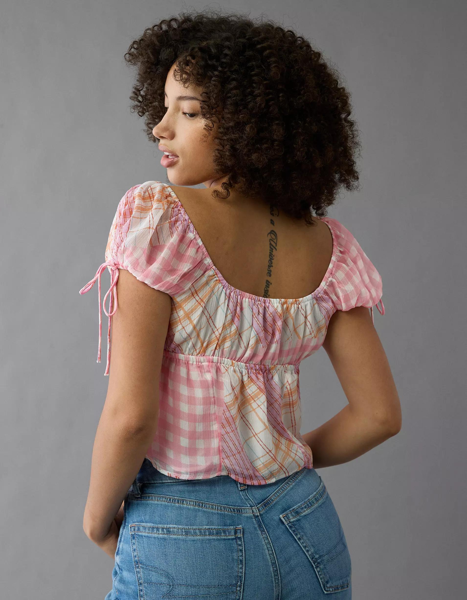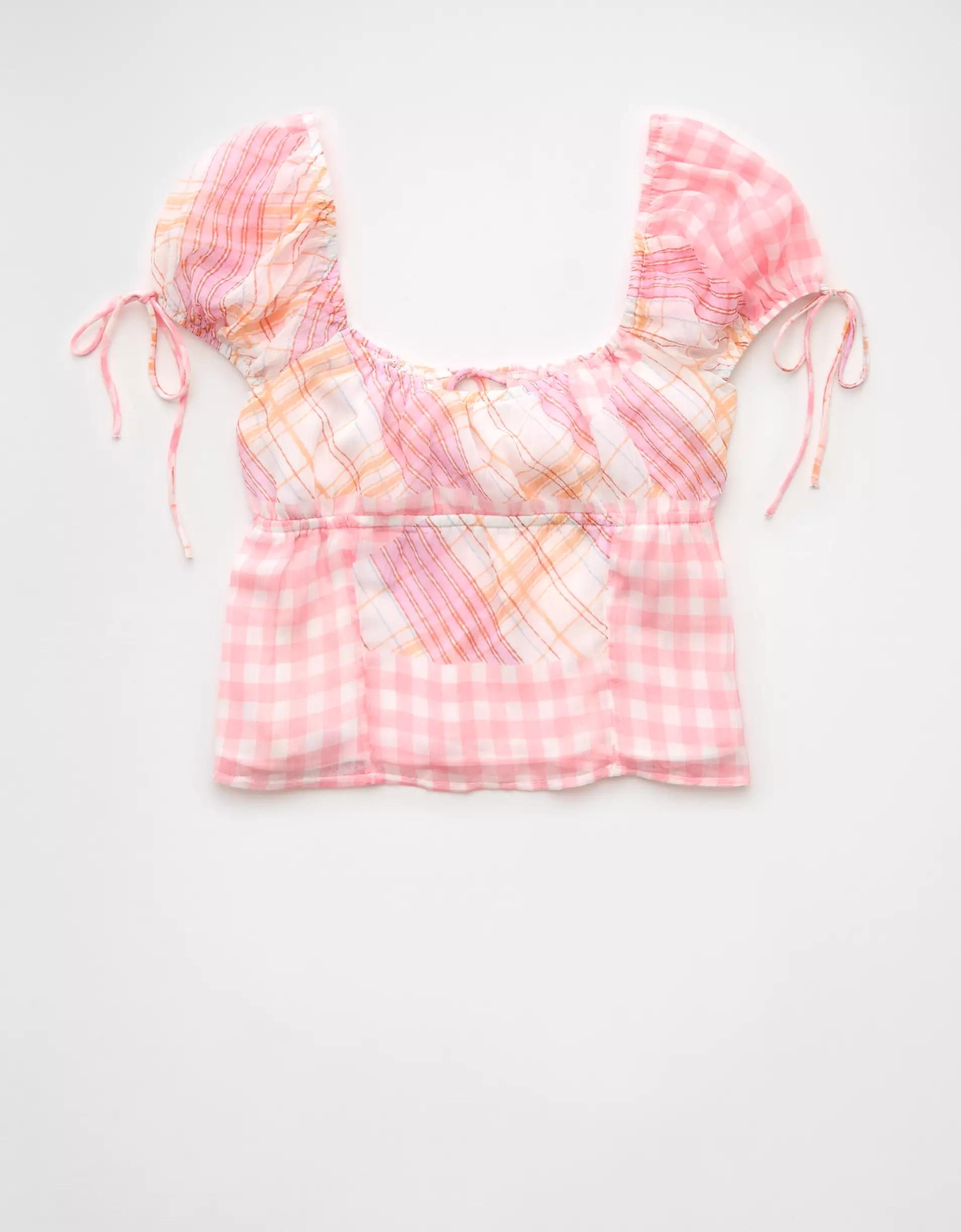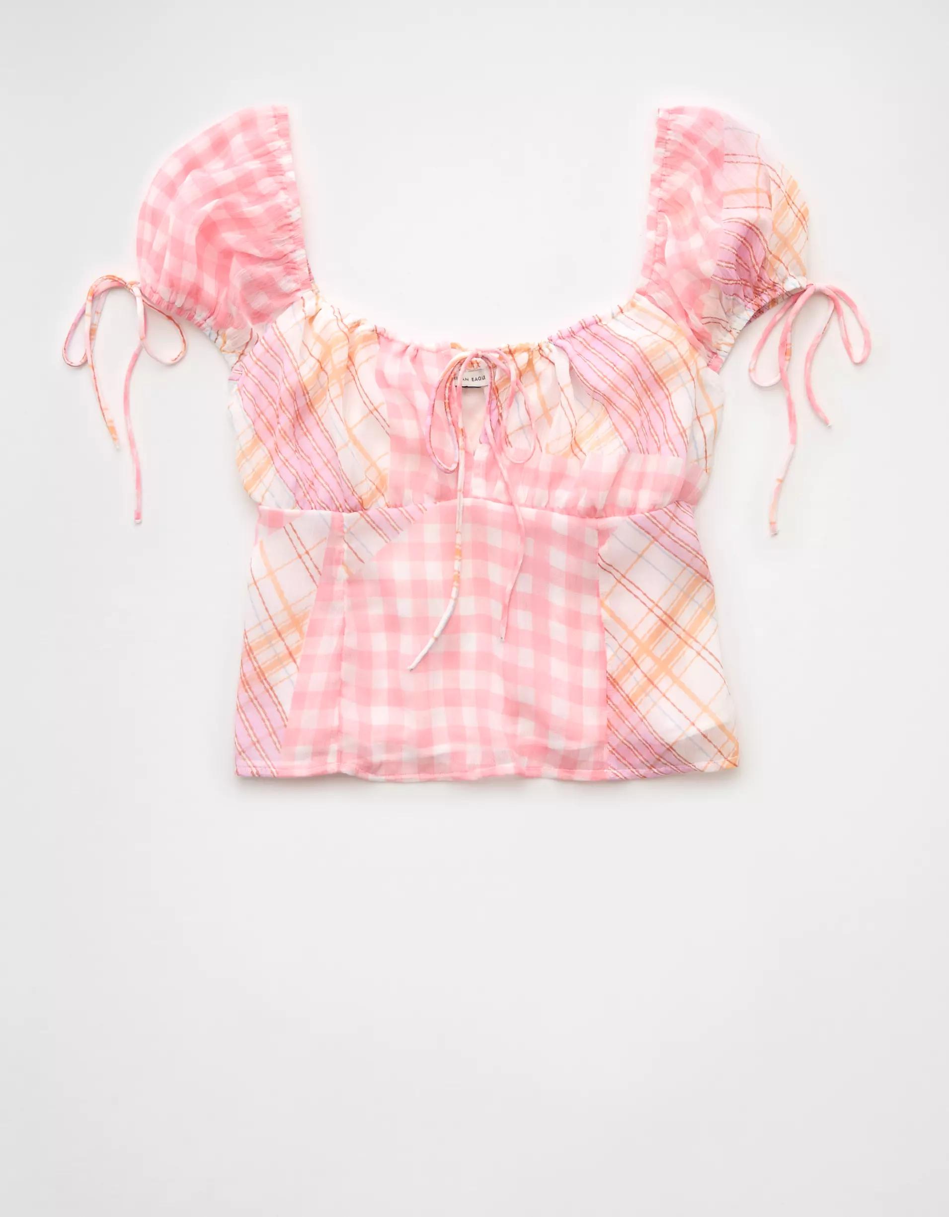 The perfect going out top, featuring fun plaid patchwork and a feminine cap sleeve.