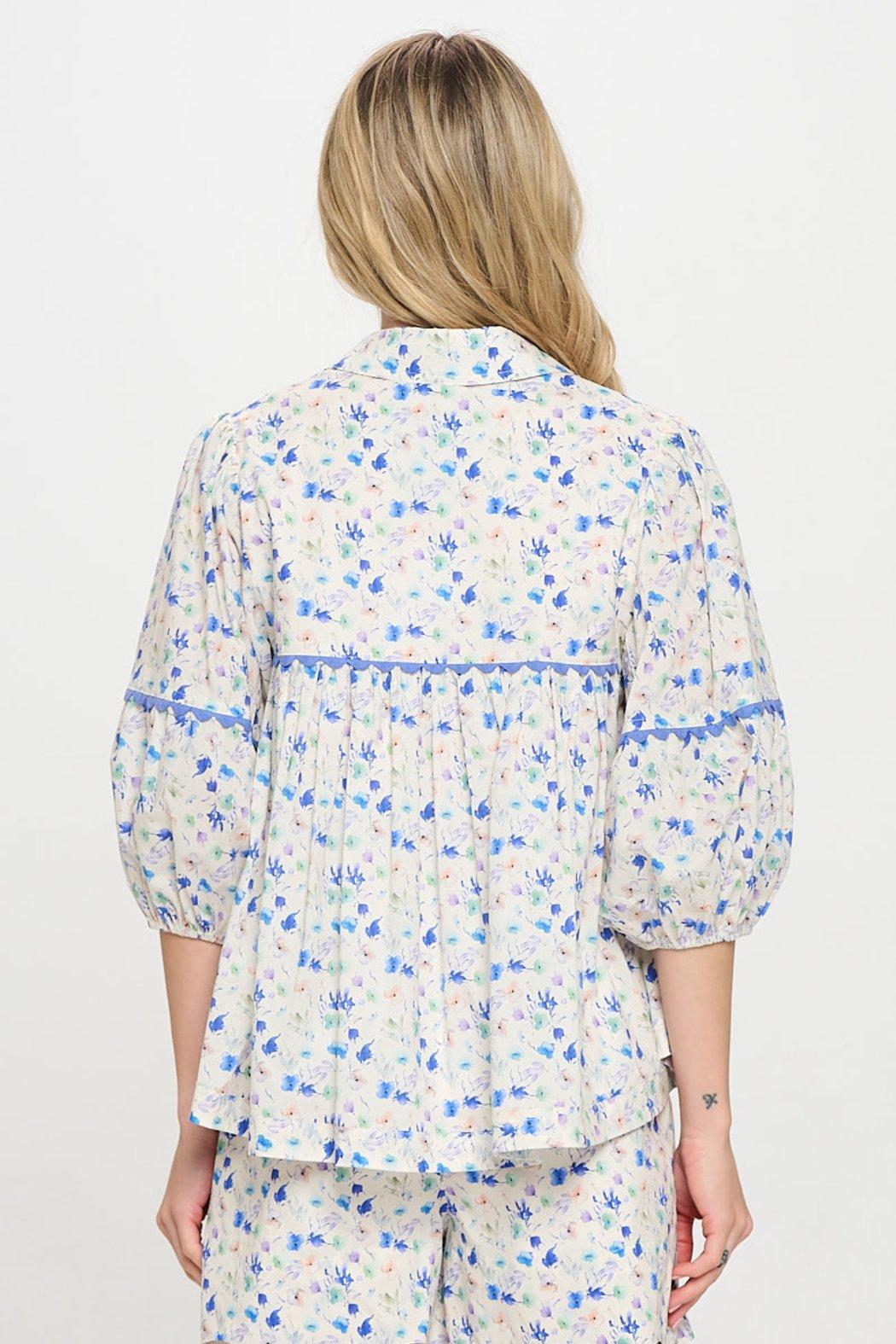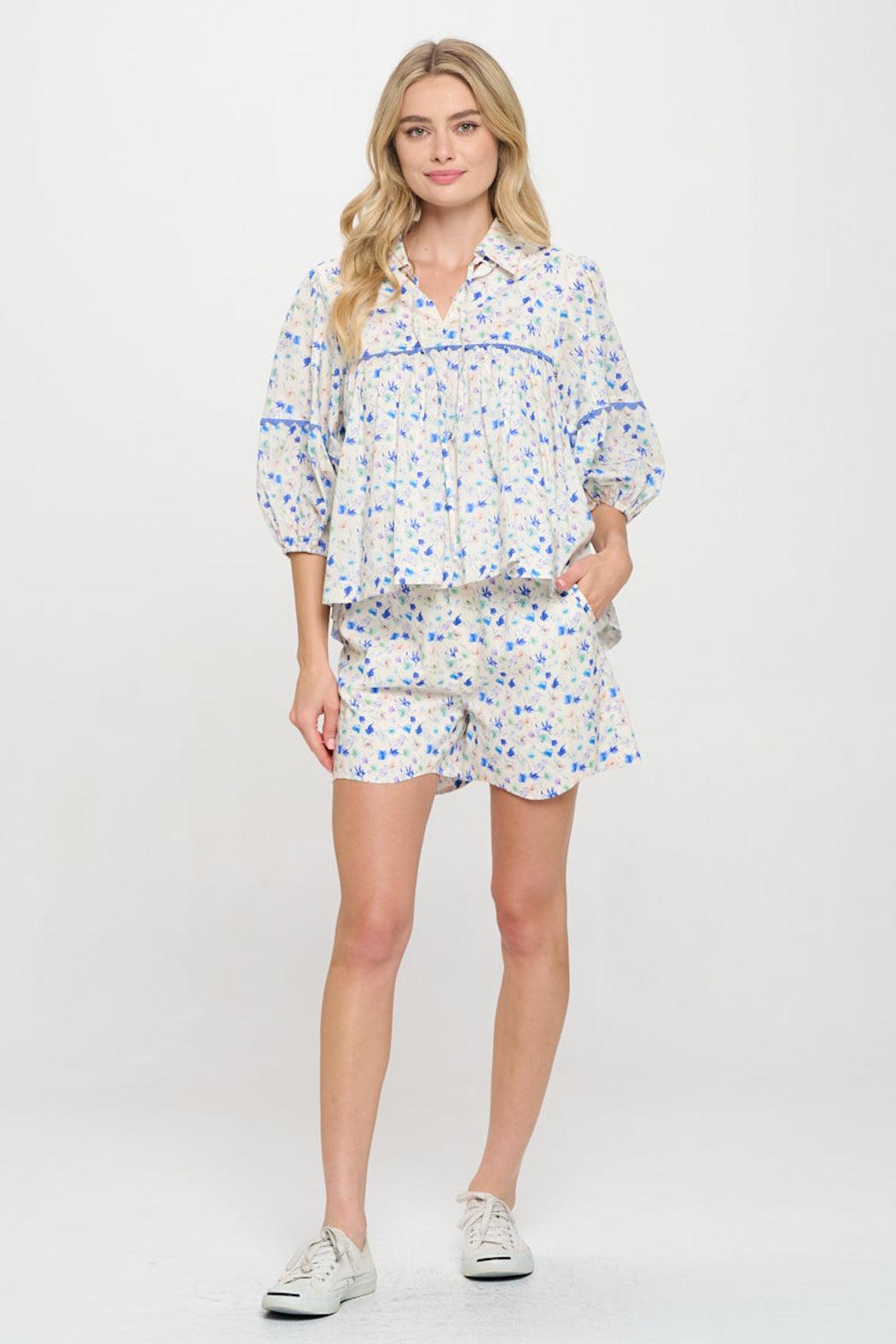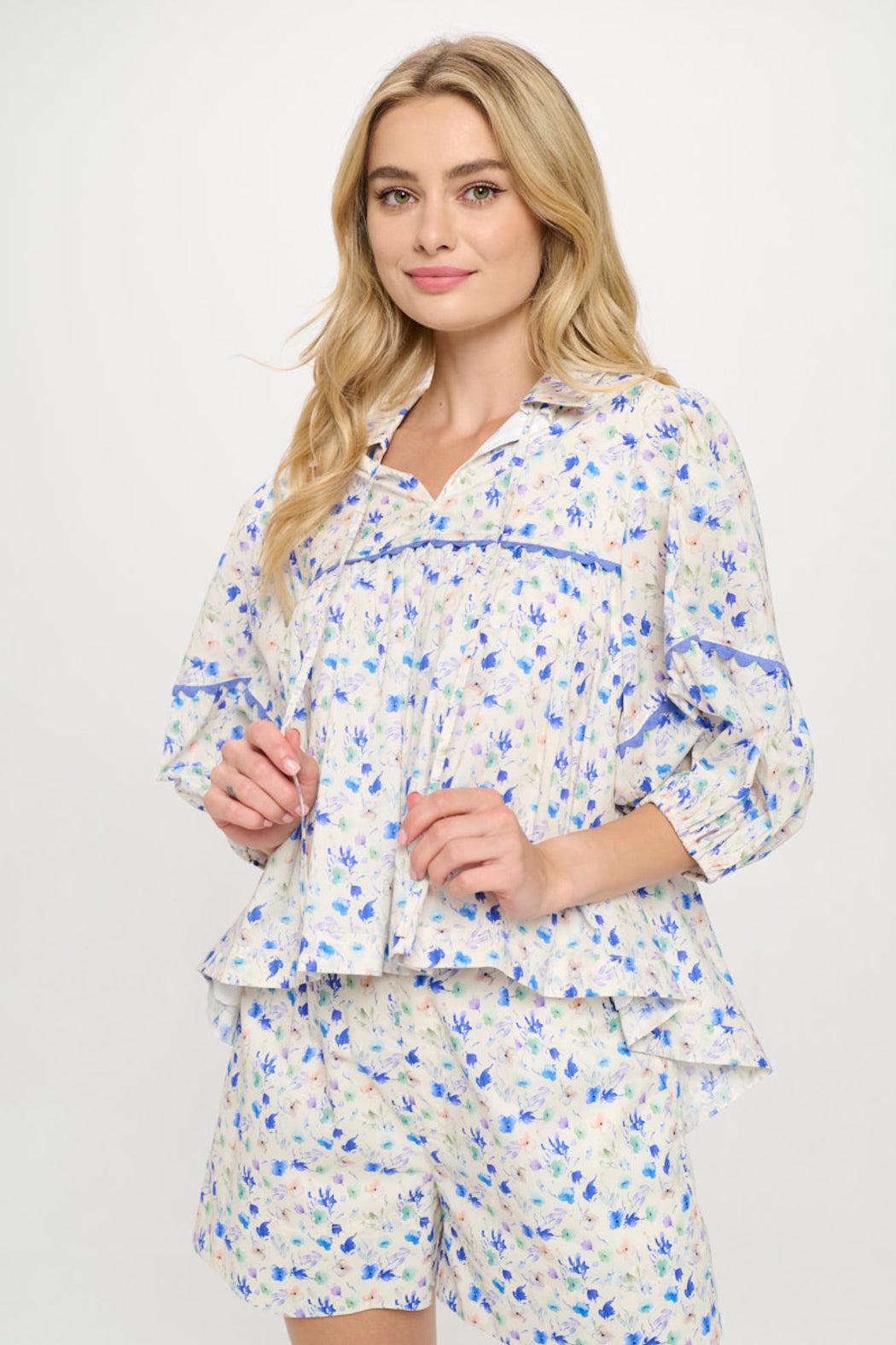 This breezy floral blouse is a springtime staple, featuring a flowy silhouette with pintuck detailing and contrast lace trim for an elevated touch. Designed with a flattering V-neckline and three-quarter sleeves, this lightweight woven top brings feminine charm to any day. Pairs beautifully with matching shorts or your favorite denim.